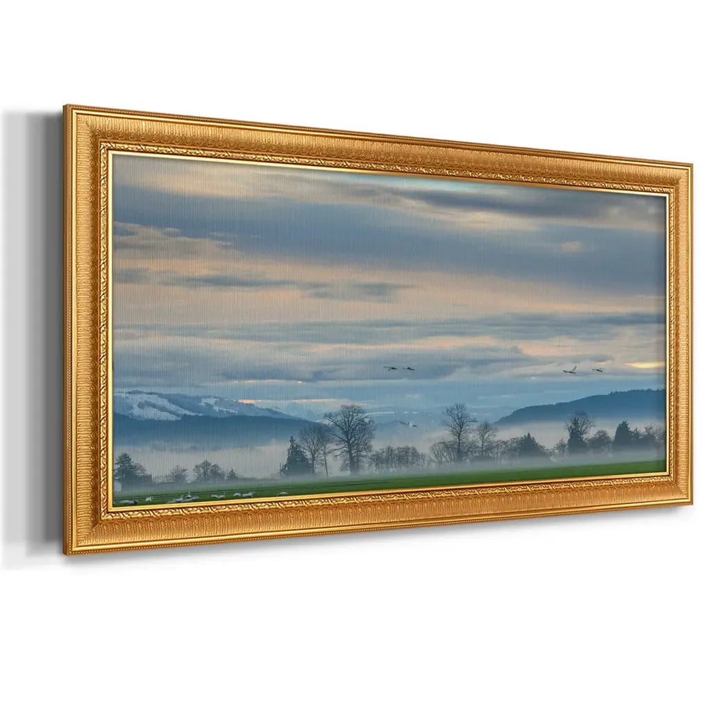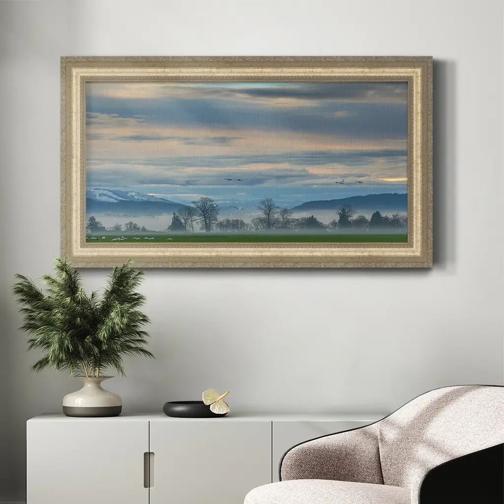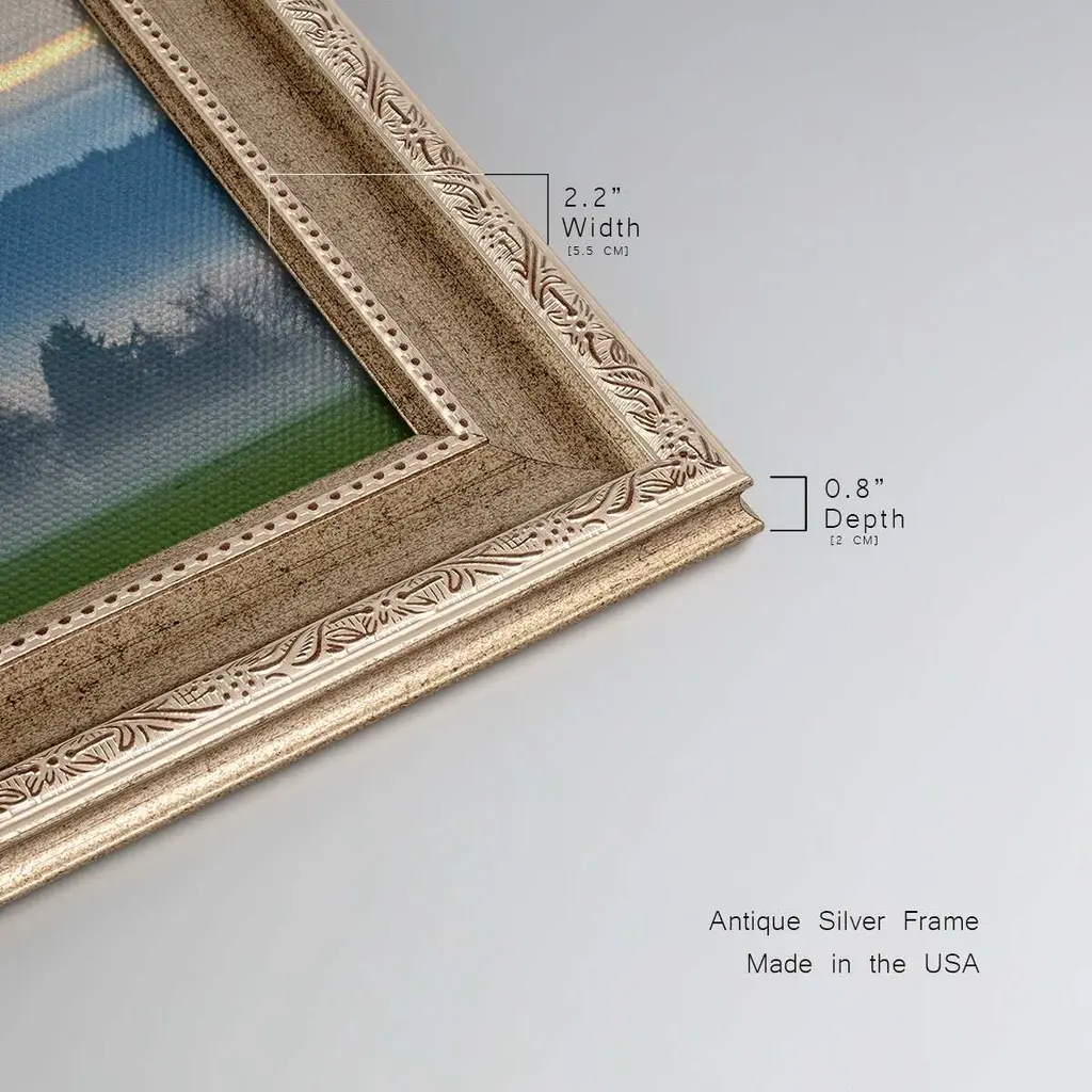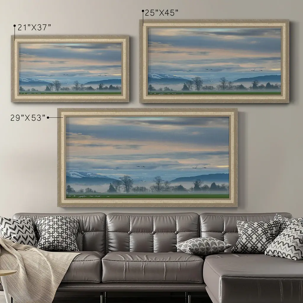 Misty Horizon Premium Framed Canvas- Ready to Hang A Premium Framed Canvas created to last. Framed in distressed wood and available in an array of sizes and colors Featuring a beveled a solid wood stretcher bar, each piece comes ready to hand 3 SIZES AVAILABLE 21''X37'' - Overall Size 25''X45'' - Overall Size 29''x53'' - Overall Size Each piece is made to order. Each piece comes with hanging hardware. Made in the USA Ready to Hang Giclee Paper Print Acrylic Glass Beveled Matt Board