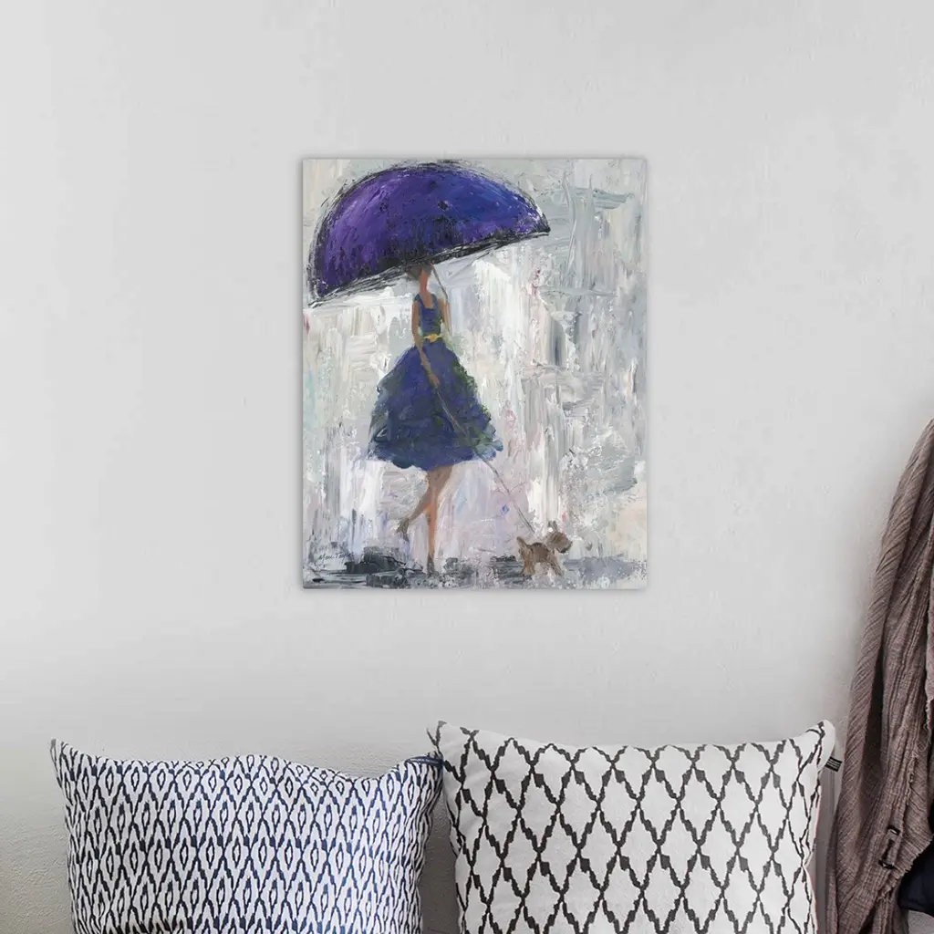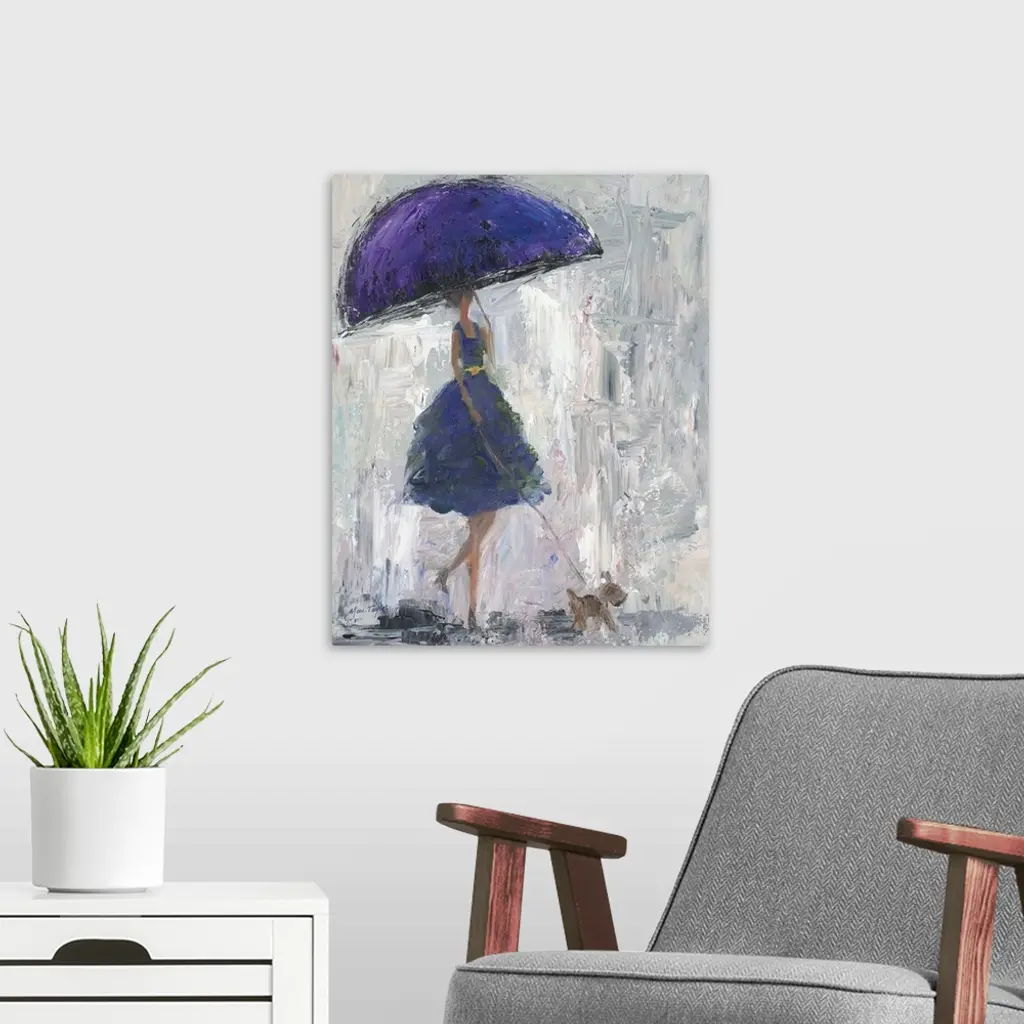 Contemporary painting of a woman in a blue dress walking in the rain with a purple umbrella.
