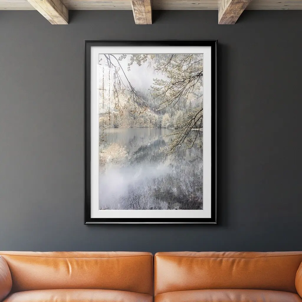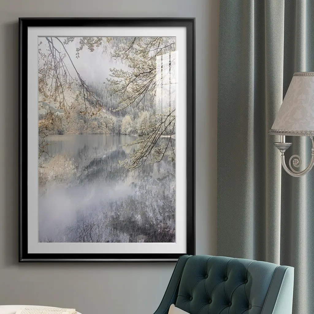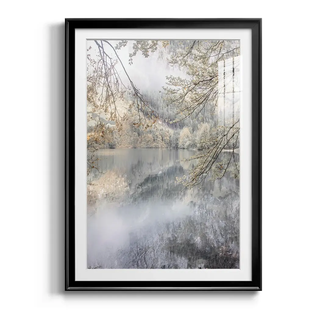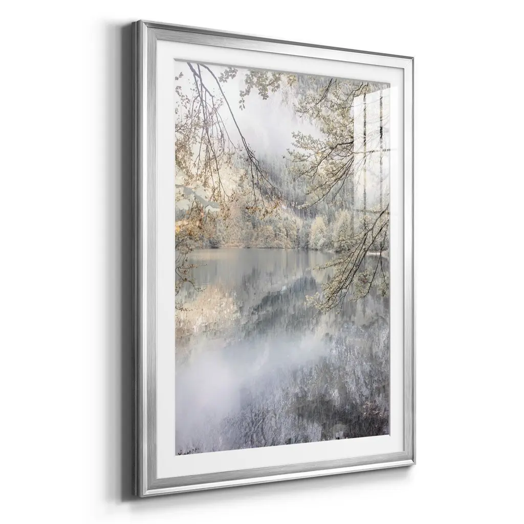 Misty Lake Premium Framed Print - Ready to Hang A Premium Framed Print created to last. Framed in distressed wood and available in an array of sizes and colors Featuring a beveled a solid wood stretcher bar, each piece comes ready to hand 4 SIZES AVAILABLE 30.5''X42.5'' - Overall Size 26.5'X36.5'' - Overall Size 22.5''x30.5'' - Overall Size 18.5''x24.5'' - Overall Size Each piece is made to order. Each piece comes with hanging hardware. Made in the USA Ready to Hang Giclee Paper Print Acrylic Glass Beveled Matt Board