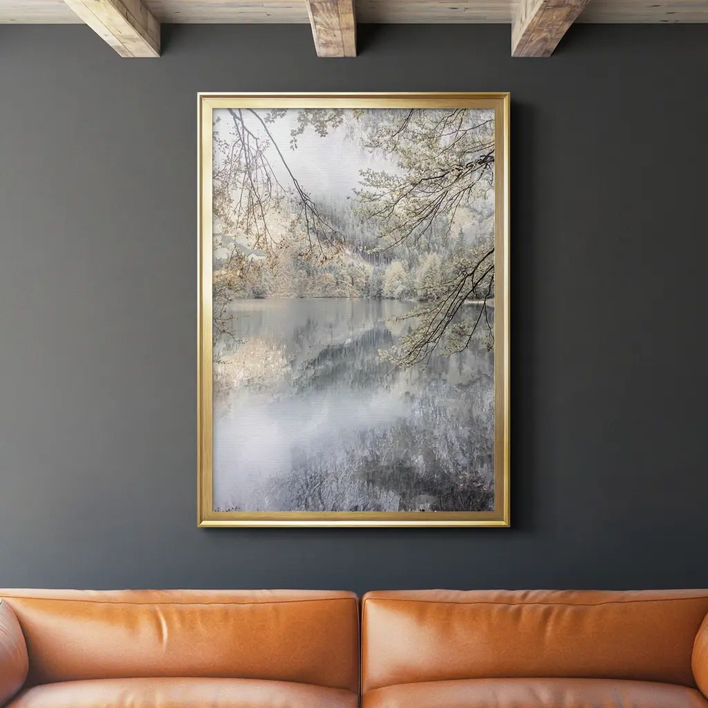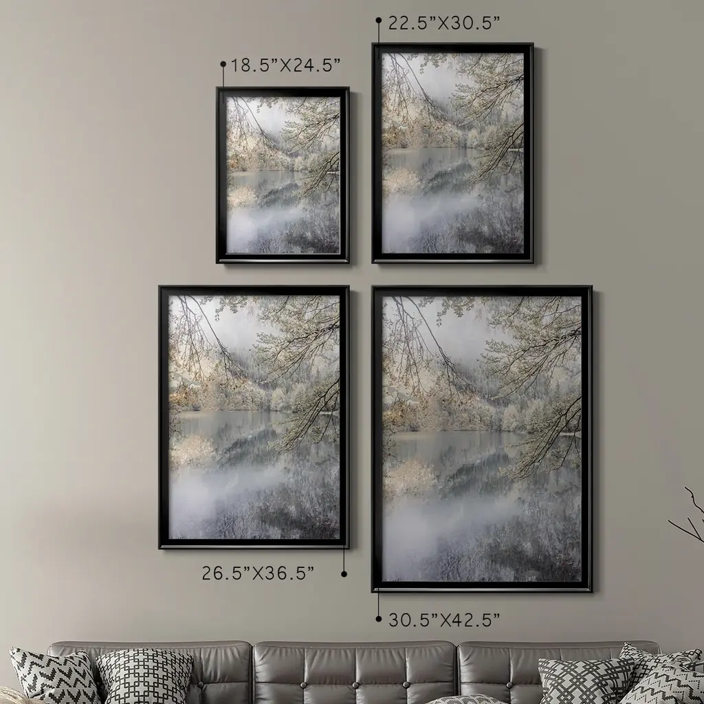 Misty Lake Premium Framed Print - Ready to Hang A Premium Framed Print created to last. Framed in distressed wood and available in an array of sizes and colors Featuring a beveled a solid wood stretcher bar, each piece comes ready to hand 4 SIZES AVAILABLE 30.5''X42.5'' - Overall Size 26.5'X36.5'' - Overall Size 22.5''x30.5'' - Overall Size 18.5''x24.5'' - Overall Size Each piece is made to order. Each piece comes with hanging hardware. Made in the USA Ready to Hang