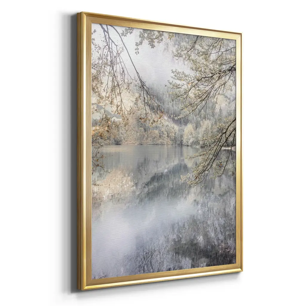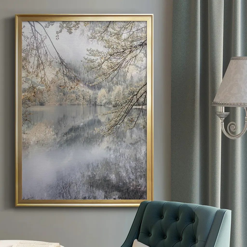 Misty Lake Premium Framed Print - Ready to Hang A Premium Framed Print created to last. Framed in distressed wood and available in an array of sizes and colors Featuring a beveled a solid wood stretcher bar, each piece comes ready to hand 4 SIZES AVAILABLE 30.5''X42.5'' - Overall Size 26.5'X36.5'' - Overall Size 22.5''x30.5'' - Overall Size 18.5''x24.5'' - Overall Size Each piece is made to order. Each piece comes with hanging hardware. Made in the USA Ready to Hang