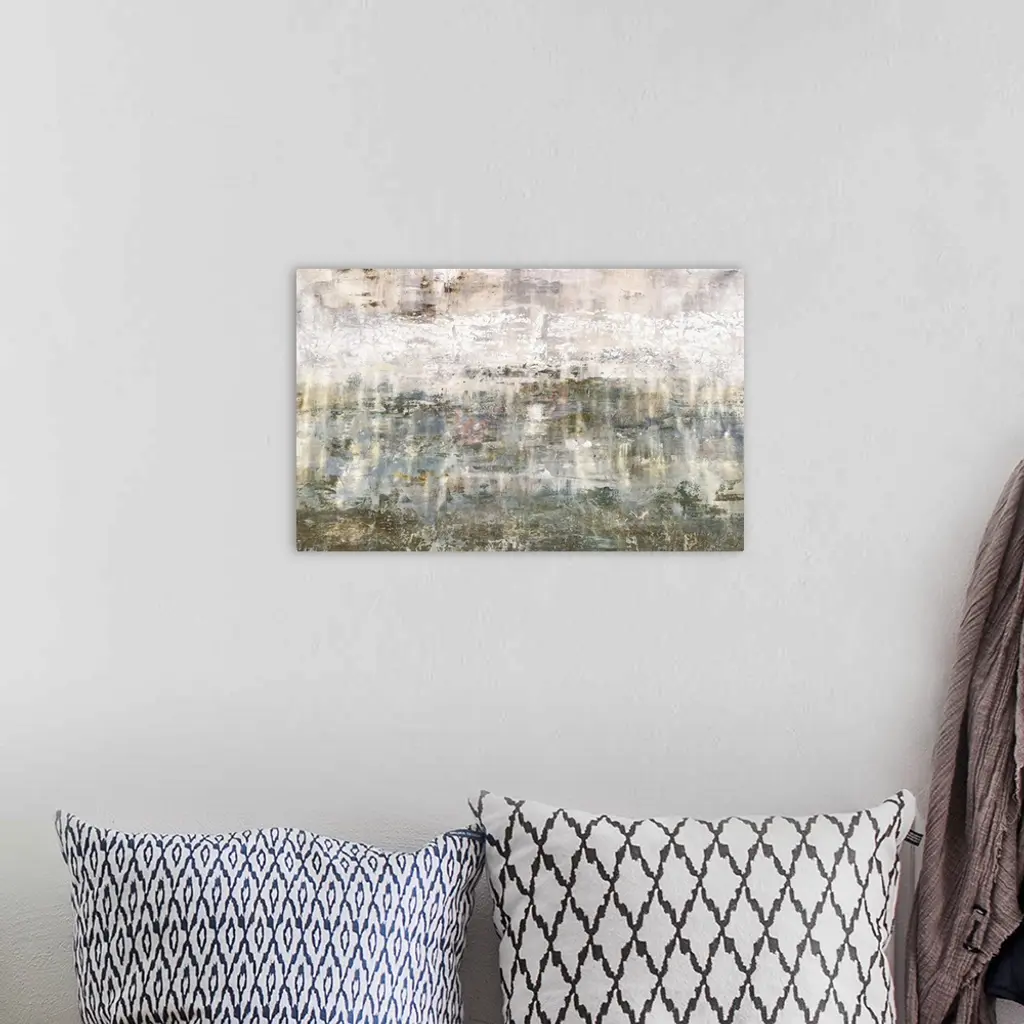 Large contemporary abstract painting created with neutral hues and a rough looking finish to create texture.