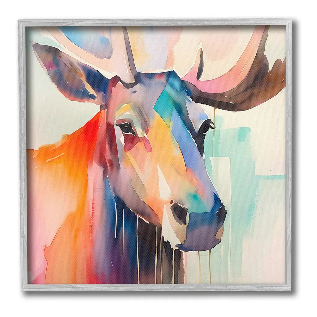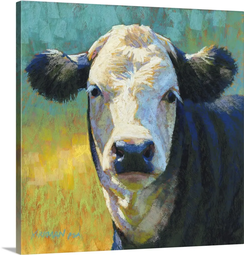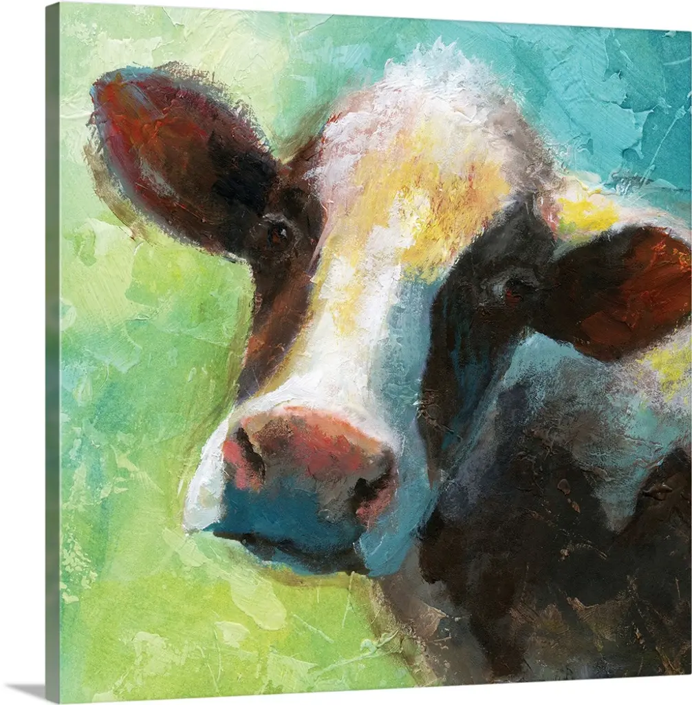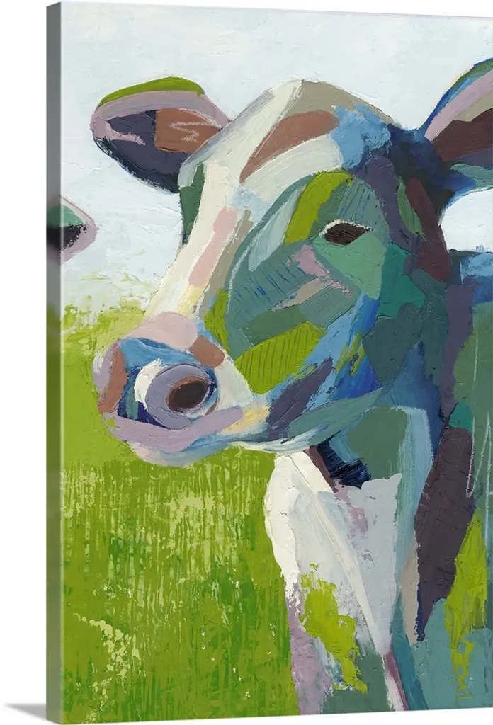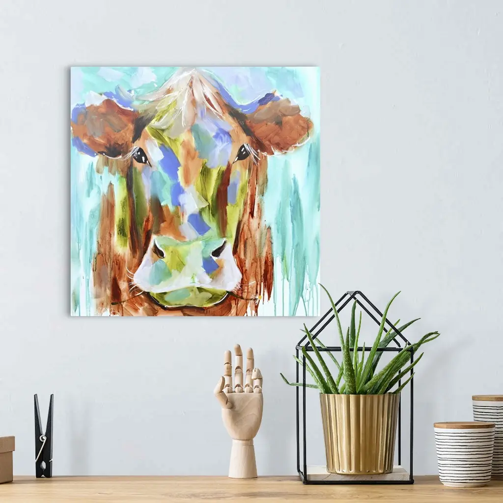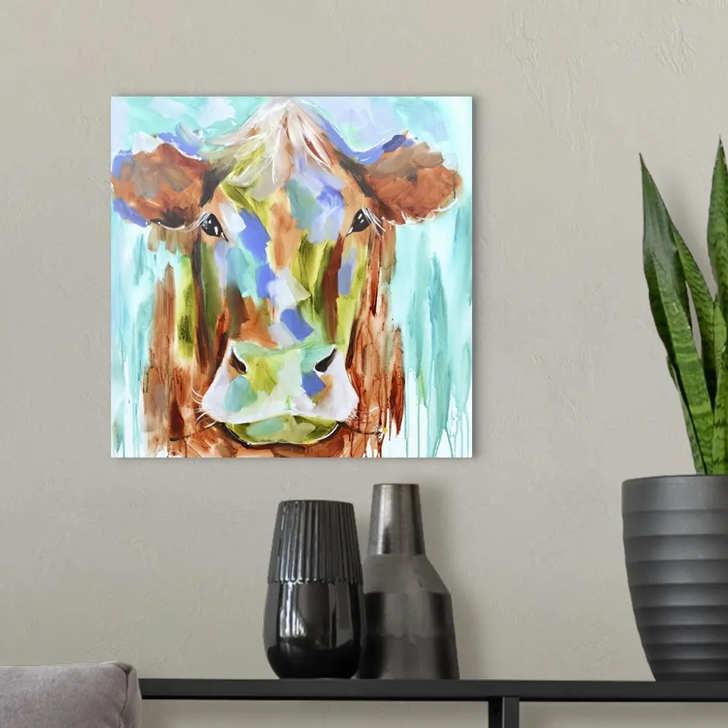 A contemporary square painting of the face of a cow done in multiple colors with strokes of blue in the background.