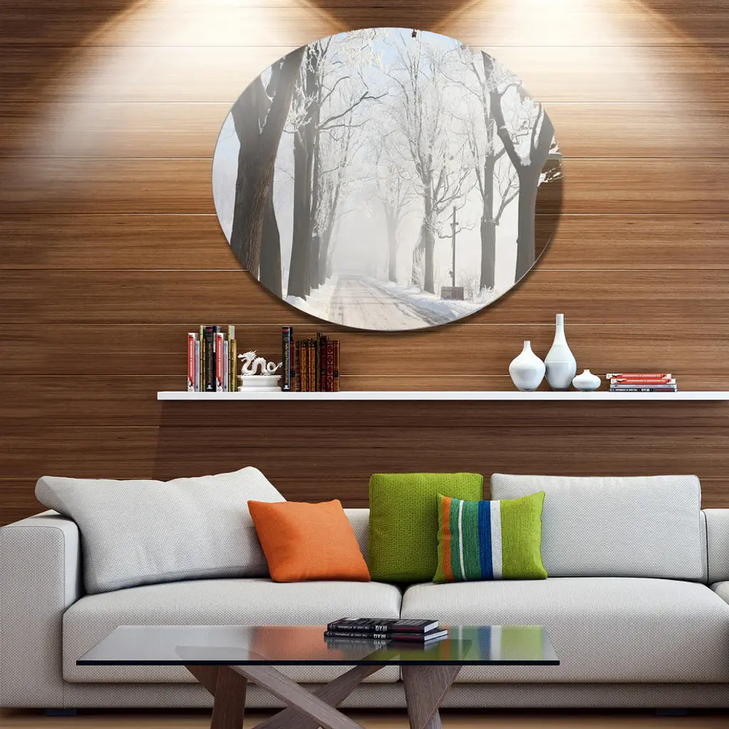 Bring Contemporary Abstraction to your home with this large Circle Metal wall art. This Misty Rural Road in Winter Forest Metal Artwork makes it the focal point of any room or office. - White Gloss Coating ensures colors are extra vibrant with light reflection.- Aluminum grade Sheet Metal with 1 inch mounting frame on the back giving the illusion that the artwork is floating on the wall..- Mounting Brackets are included along with instructions.- High Quality Digital images are created directly into a glossy aluminum panel producing a stunning and captivating print into the glossy finish of the metal.- Water, Fire and Scratch resistant HD Aluminum panels.- Looks better than any photo paper and guaranteed to last at least 20 years- Easy to clean with a microfiber cloth. Colors are far superior to regular Canvas Art. - Easy to Hang