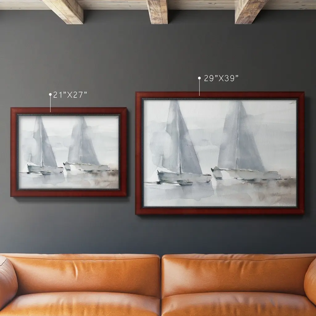Misty Sails I Premium Framed Canvas- Ready to Hang A Premium Framed Canvas created to last. Framed in distressed wood and available in an array of sizes and colors Featuring a beveled a solid wood stretcher bar, each piece comes ready to hand 3 SIZES AVAILABLE 16''X20'' - Overall Size 18'X27'' - Overall Size 24''x36'' - Overall Size Each piece is made to order. Each piece comes with hanging hardware. Made in the USA Ready to Hang Giclee Paper Print Acrylic Glass Beveled Matt Board