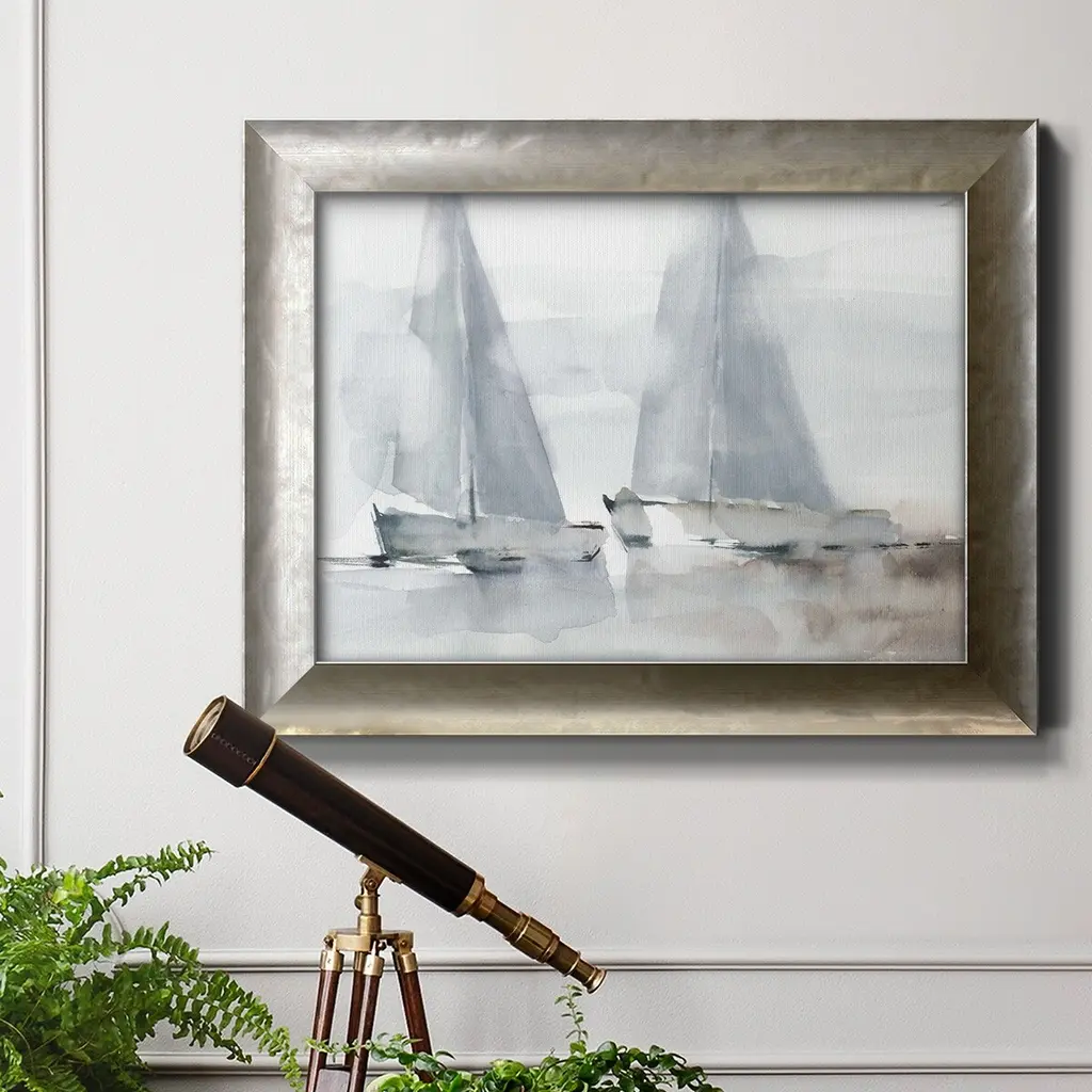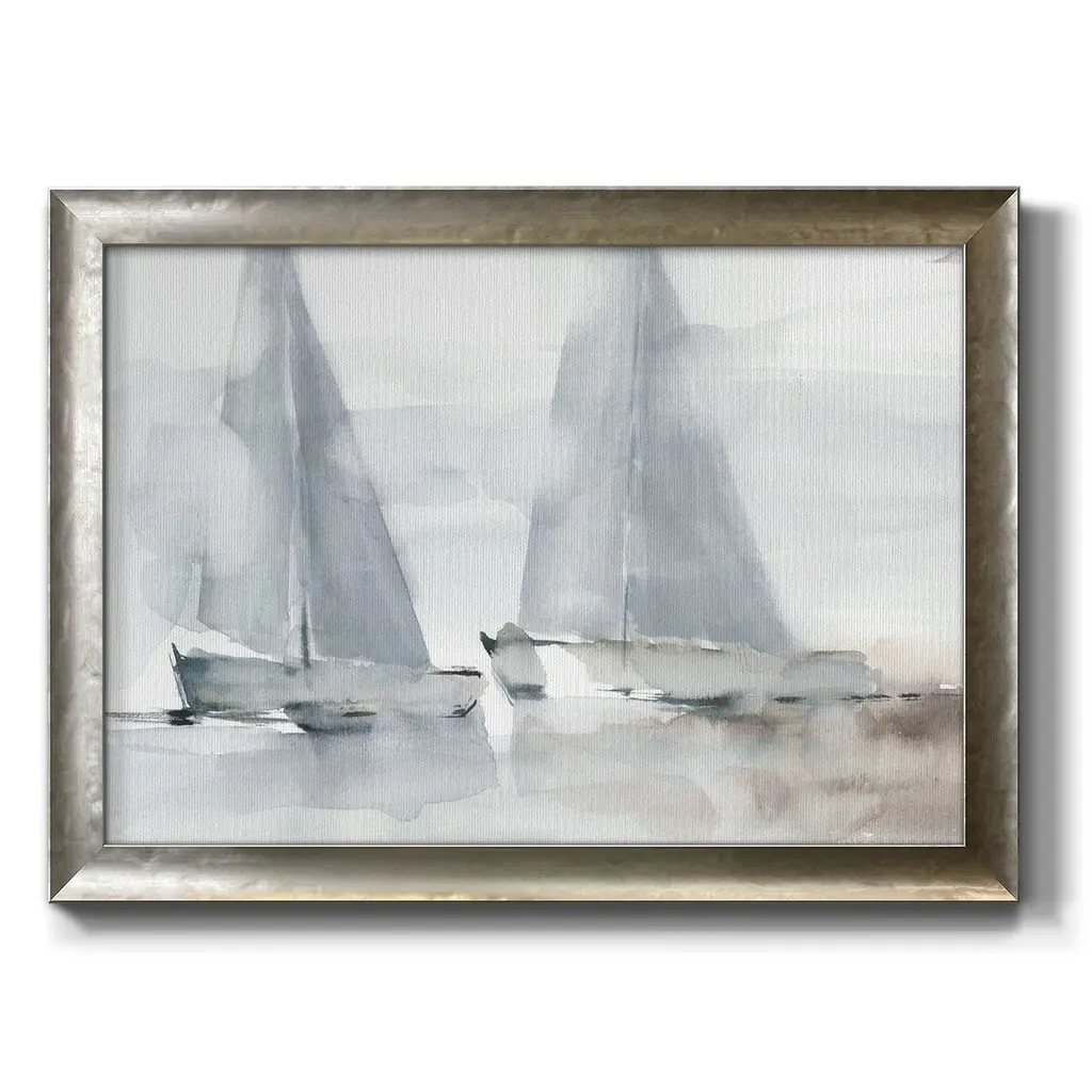 Misty Sails I Premium Framed Canvas- Ready to Hang A Premium Framed Canvas created to last. Framed in distressed wood and available in an array of sizes and colors Featuring a beveled a solid wood stretcher bar, each piece comes ready to hand 3 SIZES AVAILABLE 16''X20'' - Overall Size 18'X27'' - Overall Size 24''x36'' - Overall Size Each piece is made to order. Each piece comes with hanging hardware. Made in the USA Ready to Hang Giclee Paper Print Acrylic Glass Beveled Matt Board