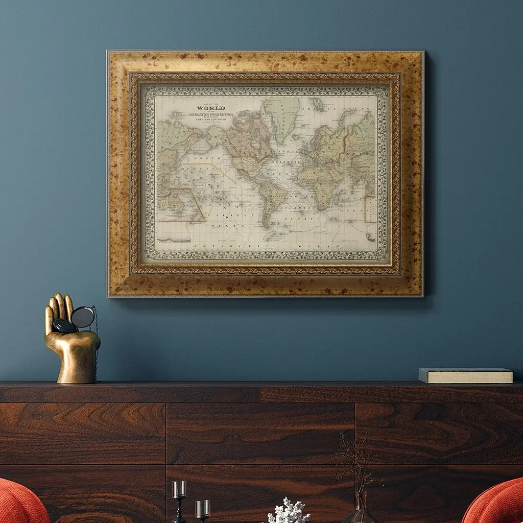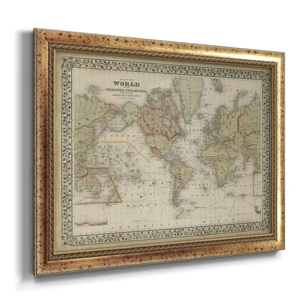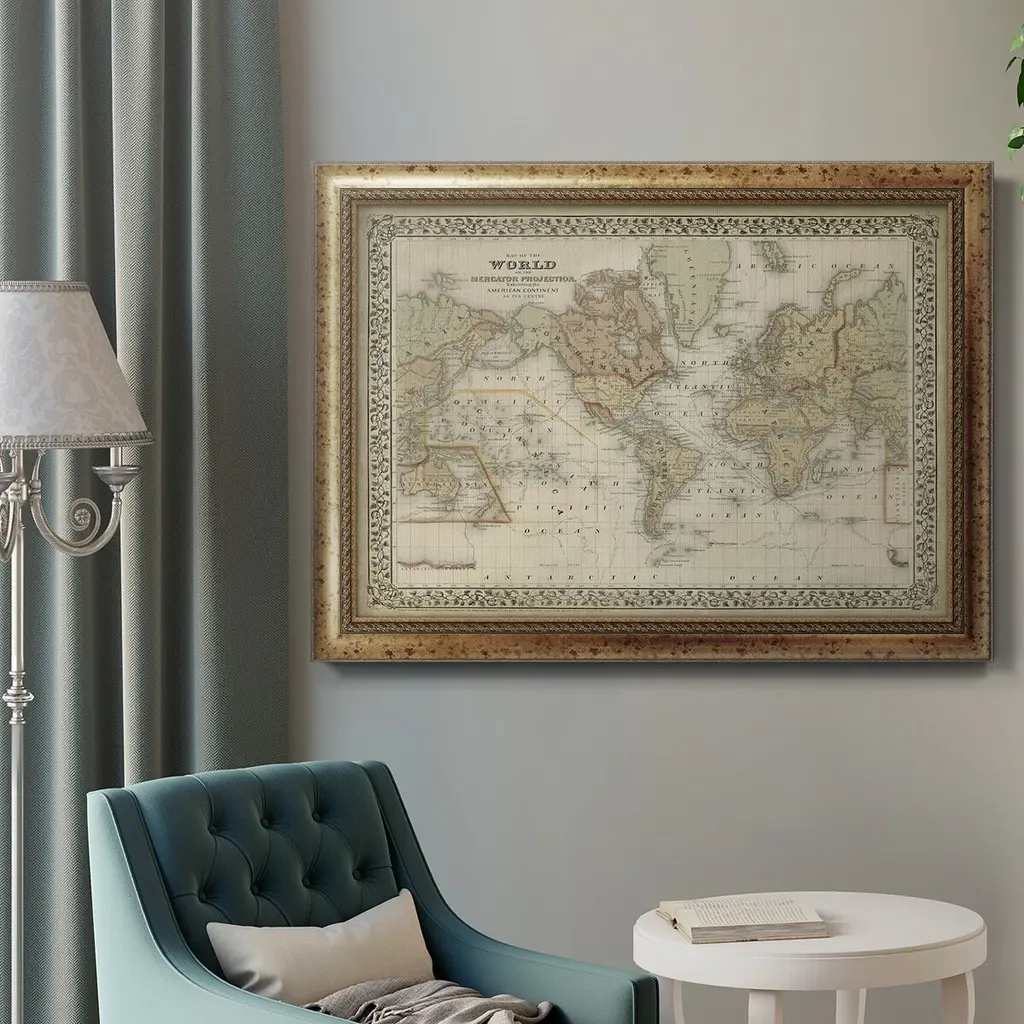 Mitchell's World Map Premium Framed Canvas- Ready to Hang A Premium Framed Canvas created to last. Framed in distressed wood and available in an array of sizes and colors Featuring a beveled a solid wood stretcher bar, each piece comes ready to hand 3 SIZES AVAILABLE 16''X20'' - Overall Size 18'X27'' - Overall Size 24''x36'' - Overall Size Each piece is made to order. Each piece comes with hanging hardware. Made in the USA Ready to Hang Giclee Paper Print Acrylic Glass Beveled Matt Board