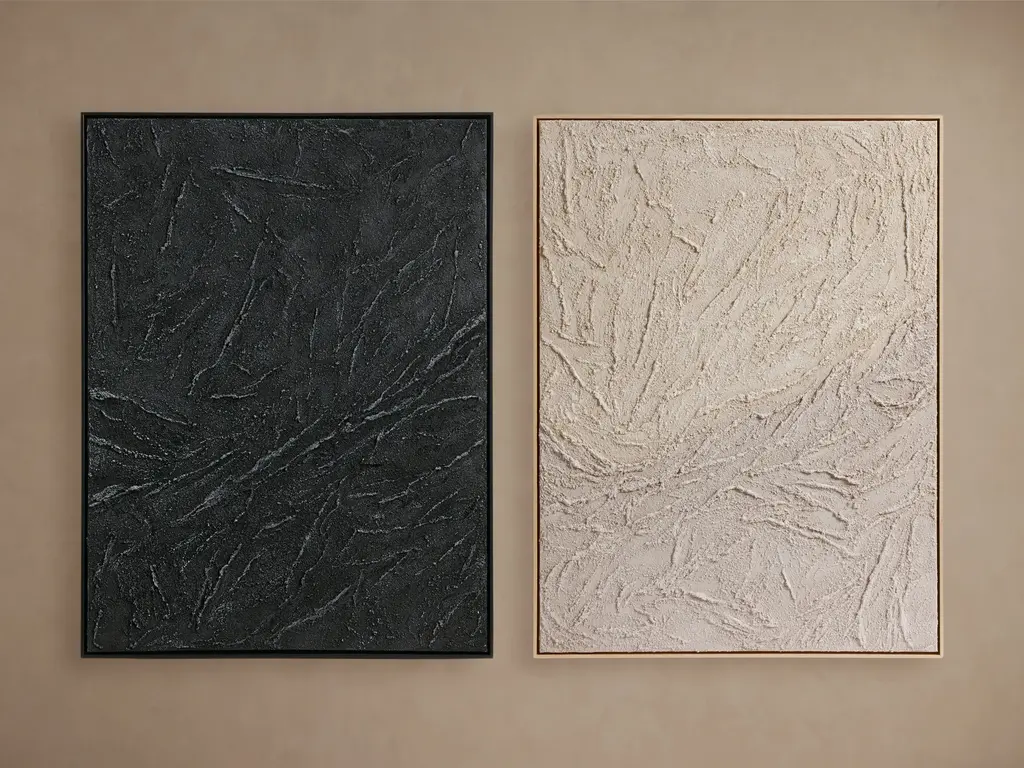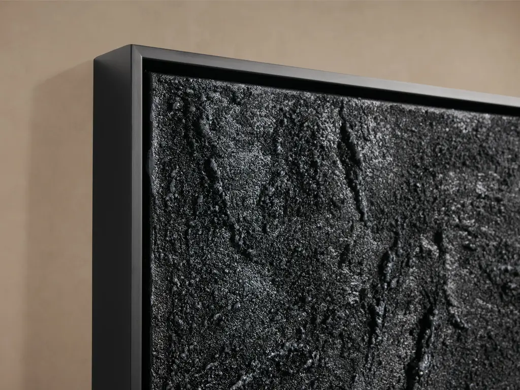 Our Mixed Media canvas wall art features hand-layered monochromatic colorways that take three dimensionality to the next level through extreme textural layers. Guiding viewers around the artwork, a sense of depth is created through exaggerated highlights and shadows cast from the rough surface reminiscent of dark volcanic rock. Surrounded with a floater frame, viewers are invited to observe and admire the dynamic rocky textures and unexpected materials used at close range. Gallery-wrapped pumice stone and oil paint mixed media on canvas surrounded by a hand-stained poplar wood frame. Mix and match colorways to create a modern, textural arrangement in your home. Hangs vertically from back-mounted D-rings. These artworks are created by hand; slight inconsistencies are to be expected, ensuring that each piece is truly one-of-a-kind.
