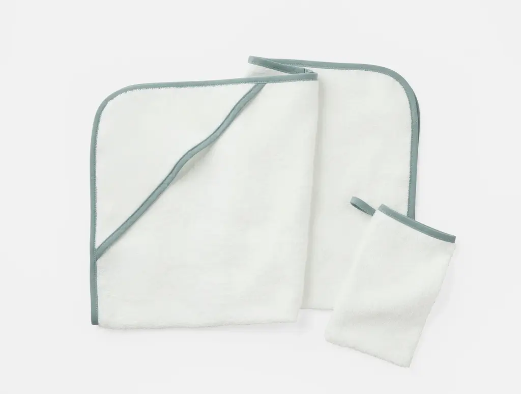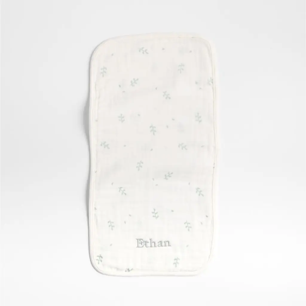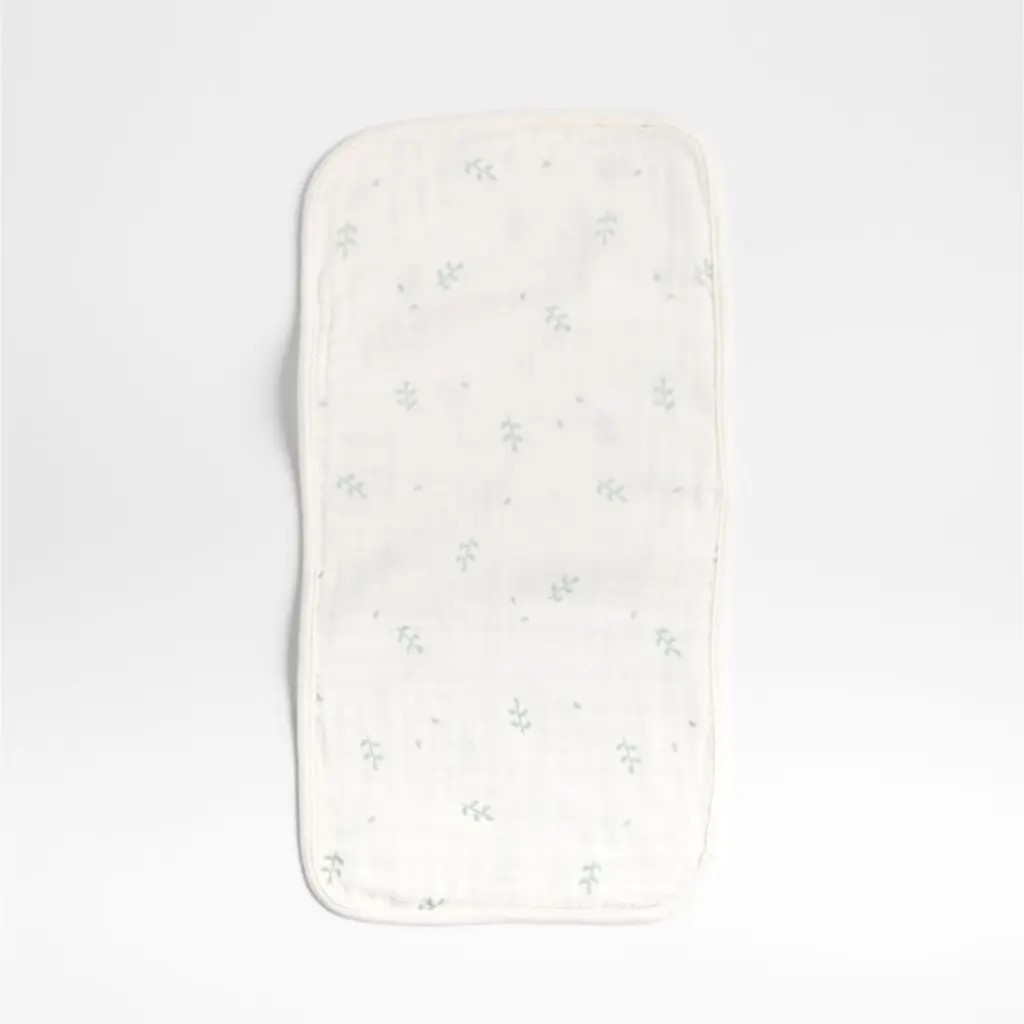 A true first-year essential, our set of 100% organic cotton gauze baby burp cloths puts three adorable designs in one sweet (and highly giftable) bundle. Including one solid, one dotted and one hand-drawn leaf print, the lightweight, absorbent burp cloths feature a color scheme of muted teal and ivory. Complete the look with our coordinating bibs (sold separately).