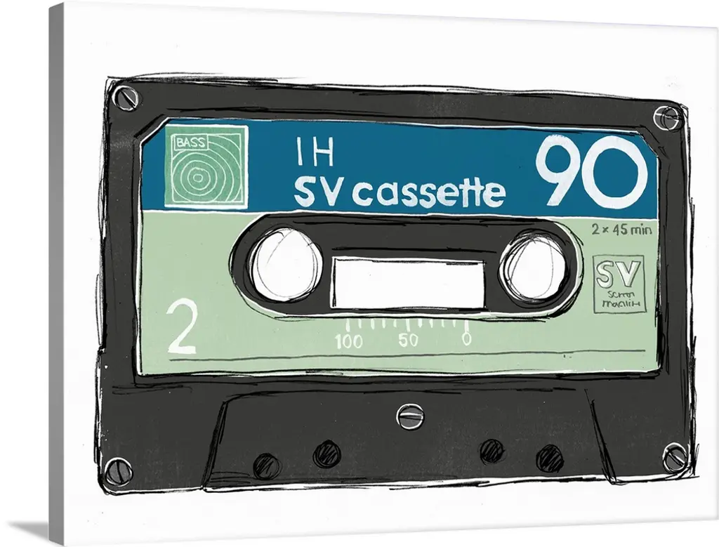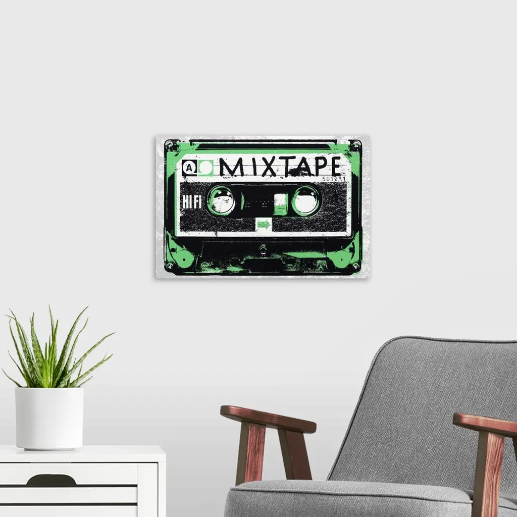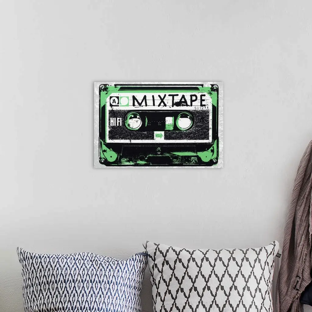 Contemporary pop art style artwork of a mixtape cassette against a green background.