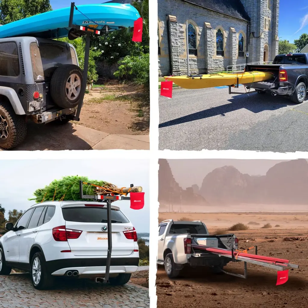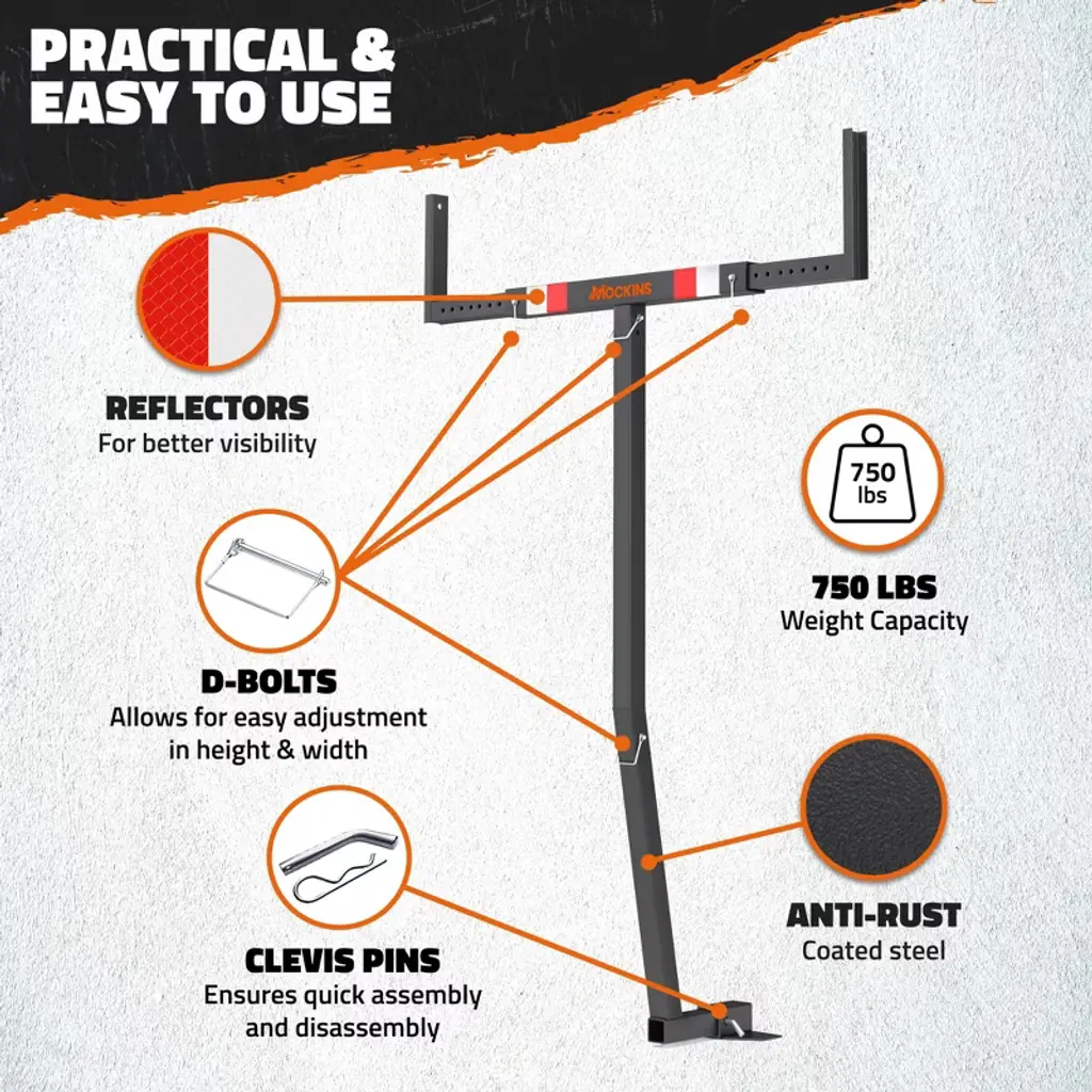 Need to haul ladders, plywood, kayaks or pipes? Tackle every oversized travel challenge with the Mockins 2-in-1 Truck Bed Extension. This heavy-duty steel truck bed extender supports up to 750 lbs., with dual functional horizontal and vertical adjustments. Whether you need extra support for the back of your truck or the roof of your SUV, the 2-in. receiver compatibility makes it a versatile option for a range of vehicle types. Plus, assembling and disassembling is straightforward and simple with easy-to-use clevis pins. We’ve also included a hitch stabilizer, ratchet straps, reflective strips and a red flag to make your trip as smooth and safe as possible. Load up with confidence on the Mockins 2-in-1 Car Cargo Extender.
