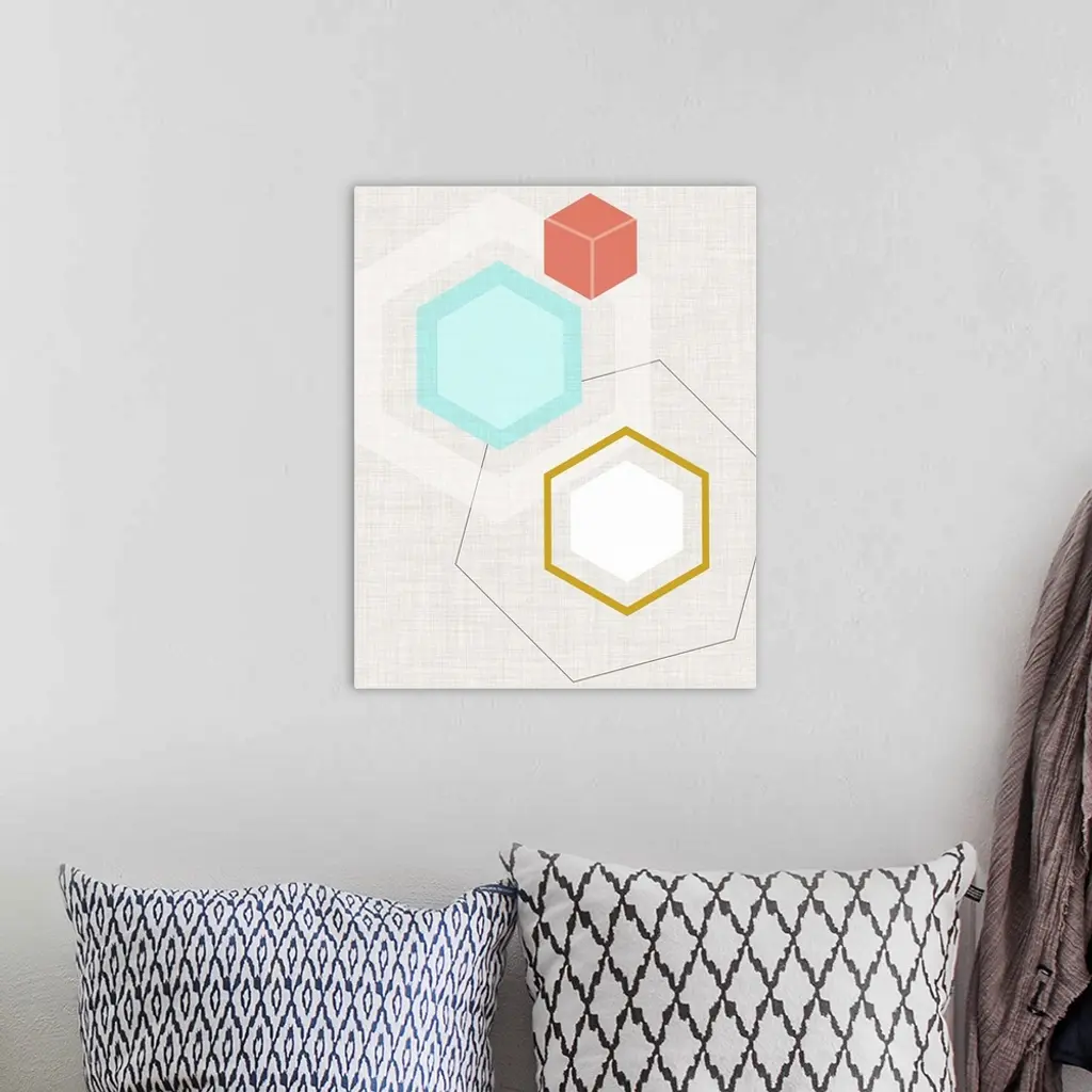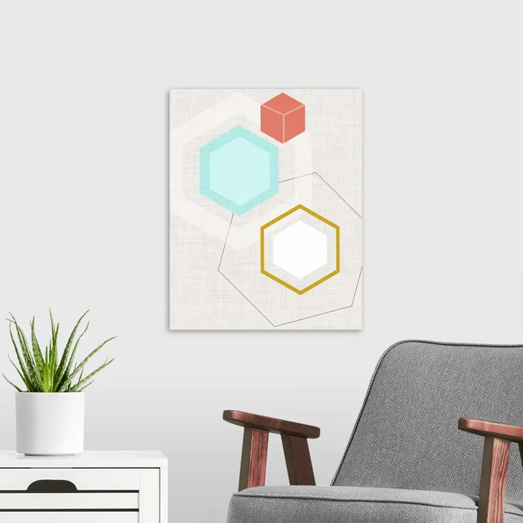 Contemporary artwork of geometric shapes in muted colors against a burlap textured background in a retro mid-century style.