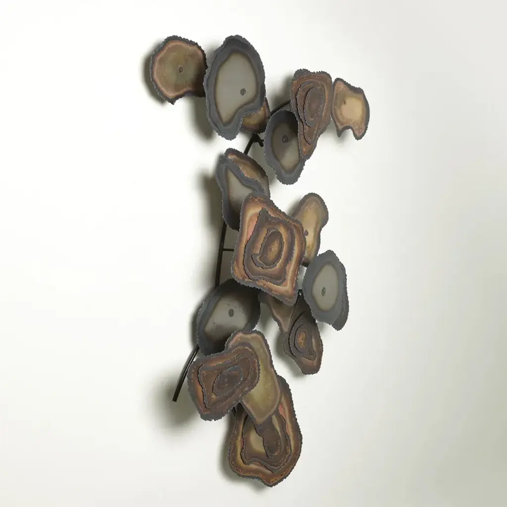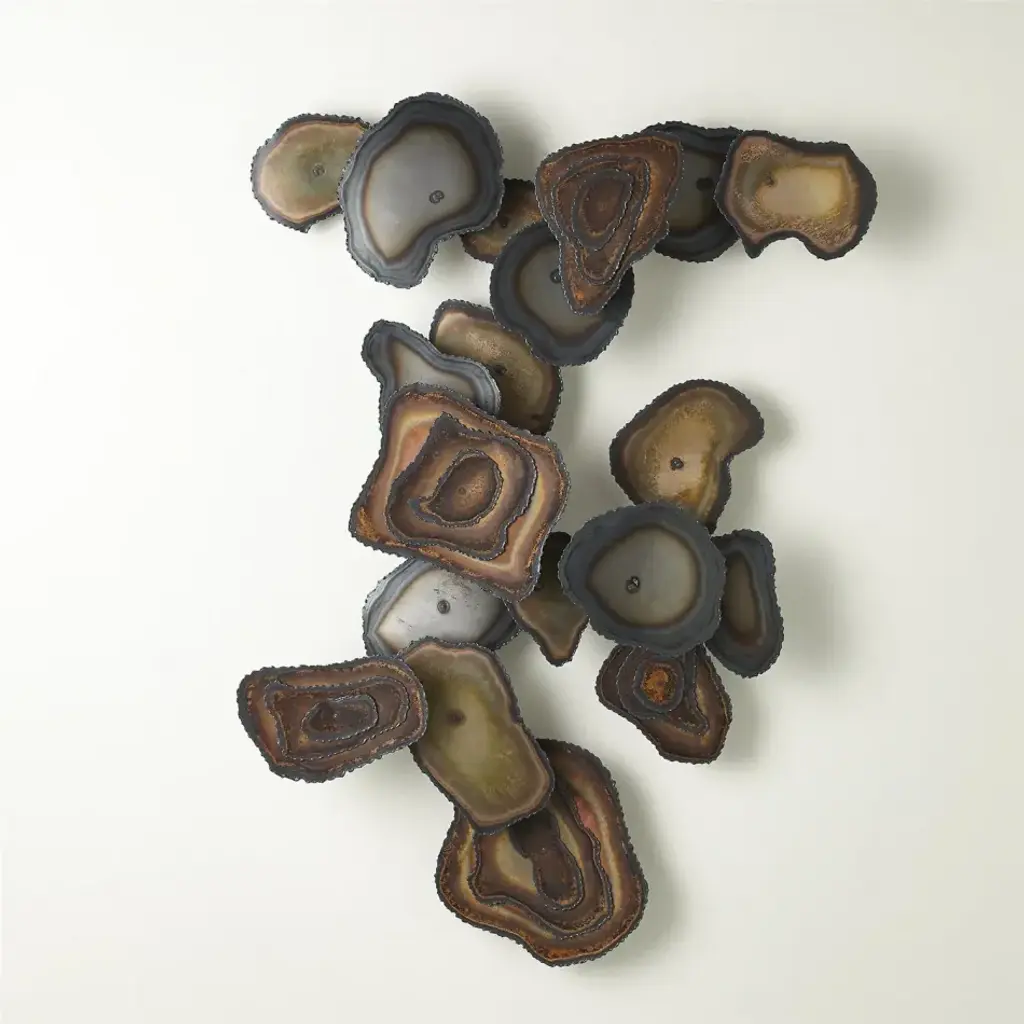 Mod Terrace Wall Art is cut iron and brass with braised edges and flamed patina. No two pieces are exactly alike. From a fashion forward perspective, Global Views offers accessories, furniture, statement lighting, and an assortment of rugs and mirrors to add beauty and joy to your home.