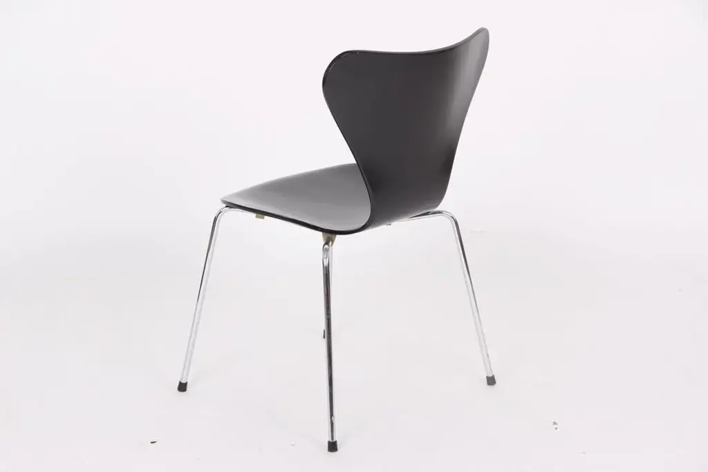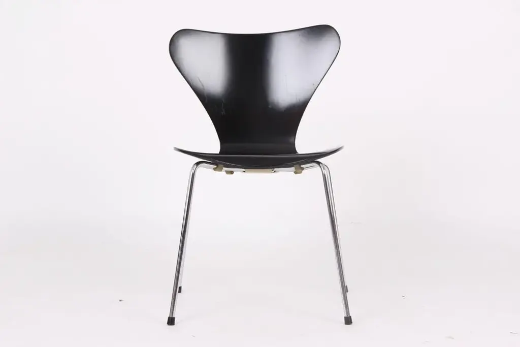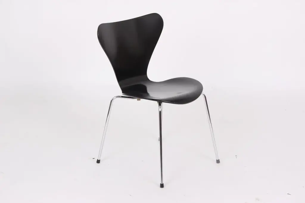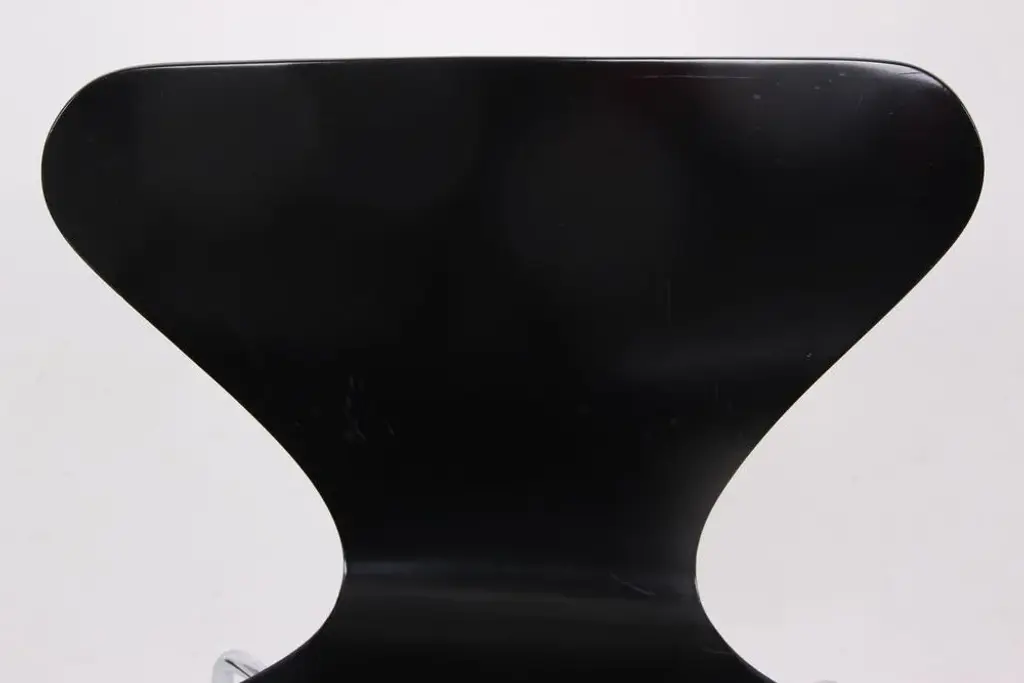 Arne Jacobsen designed the Model 3107 in 1955. Eight chairs in black are being sold here. The chairs were manufactured by Fritz Hansen and later repainted. The chairs are stable and attractive. The paint shows signs of wear and tear. The chairs are also suitable for painting or upholstering with fabric or leather. Seat height: 44.5 cm. Scratches have been touched up with black paint in several places. This piece has an attribution mark, I am sure that it is completely authentic and take full responsibility for any authenticity issues arising from misattribution