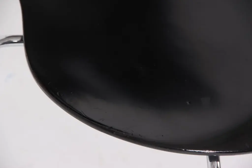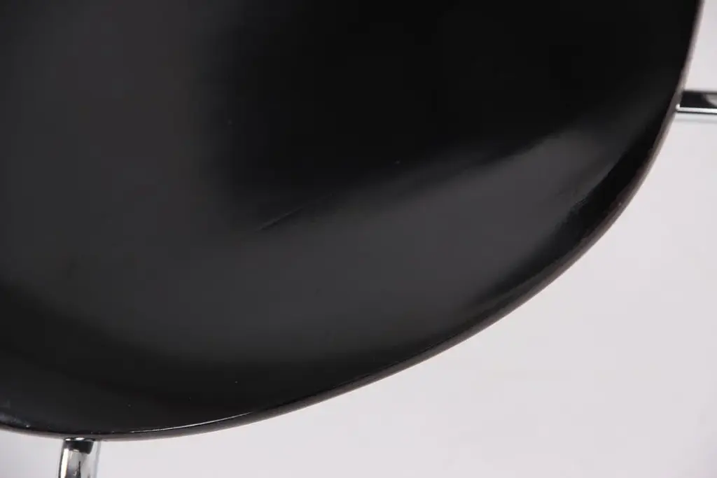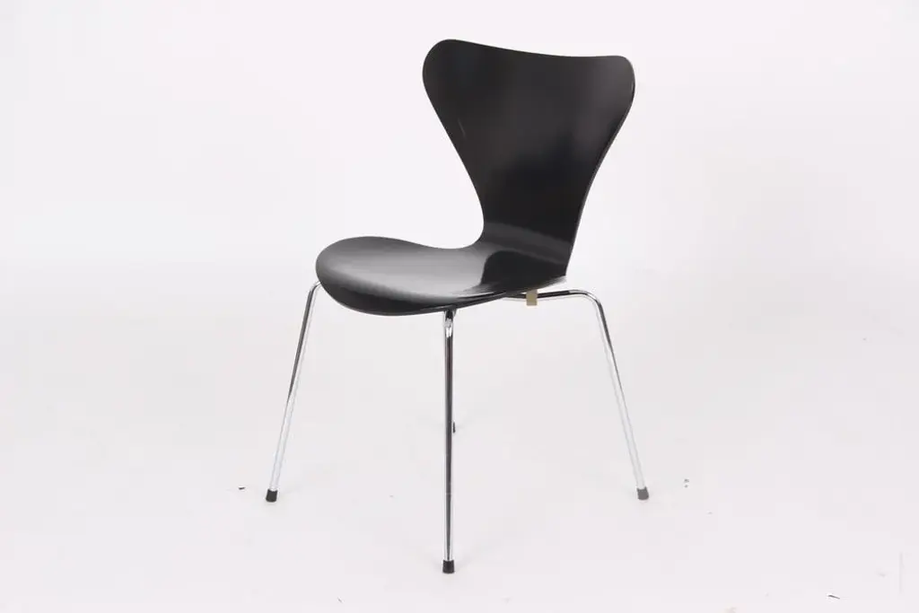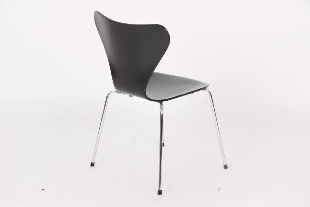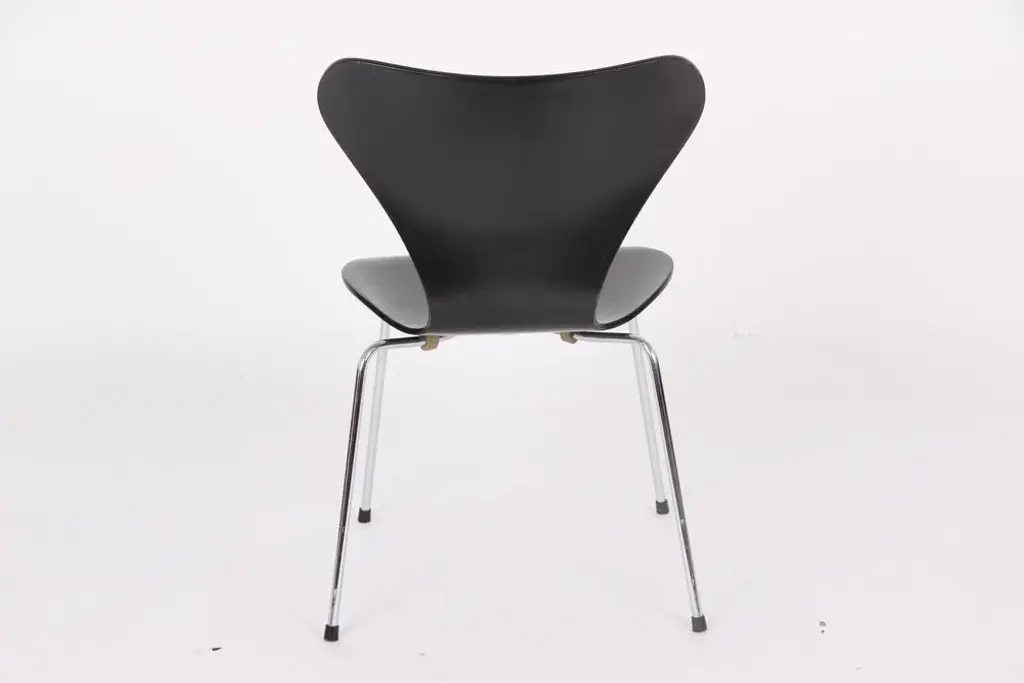 Arne Jacobsen designed the Model 3107 in 1955. Eight chairs in black are being sold here. The chairs were manufactured by Fritz Hansen and later repainted. The chairs are stable and attractive. The paint shows signs of wear and tear. The chairs are also suitable for painting or upholstering with fabric or leather. Seat height: 44.5 cm. Scratches have been touched up with black paint in several places. This piece has an attribution mark, I am sure that it is completely authentic and take full responsibility for any authenticity issues arising from misattribution