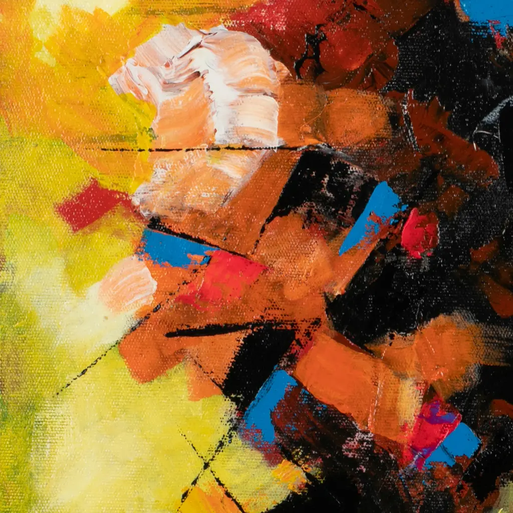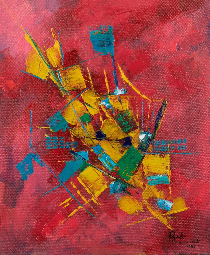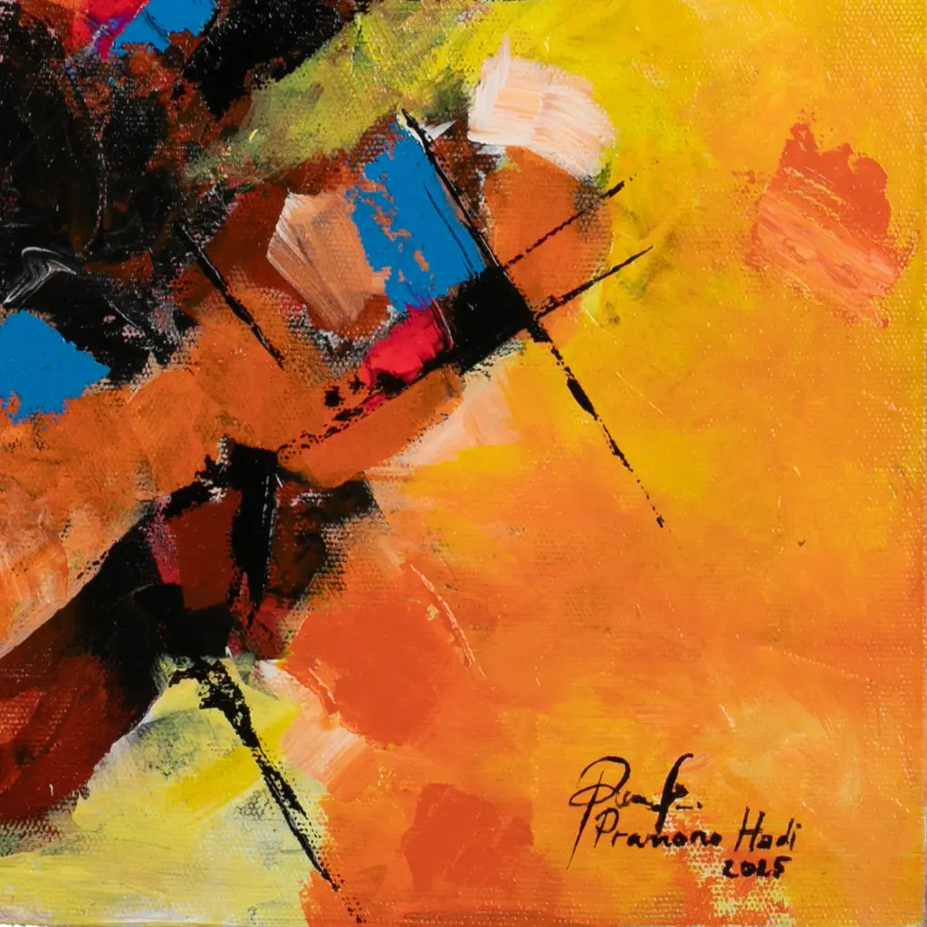 "Rain is a blessing. Wells begin to fill with water for the prosperity of the community. Drops of water hit hard on the ground, there is a melody around it. I see from the window flashes of lightning striking, unaware that the ground is wet by it. That painful reality must also happen in the heart. Until after the rainbow begins to appear and all creatures are blessed," says Javanese artist Pramono Hadi about the inspiration behind this breathtaking abstract composition. Expertly rendered in yellow, green, black, red, white and orange acrylics, this modern painting will be a focal point anywhere you choose to display it.