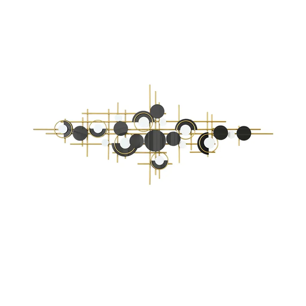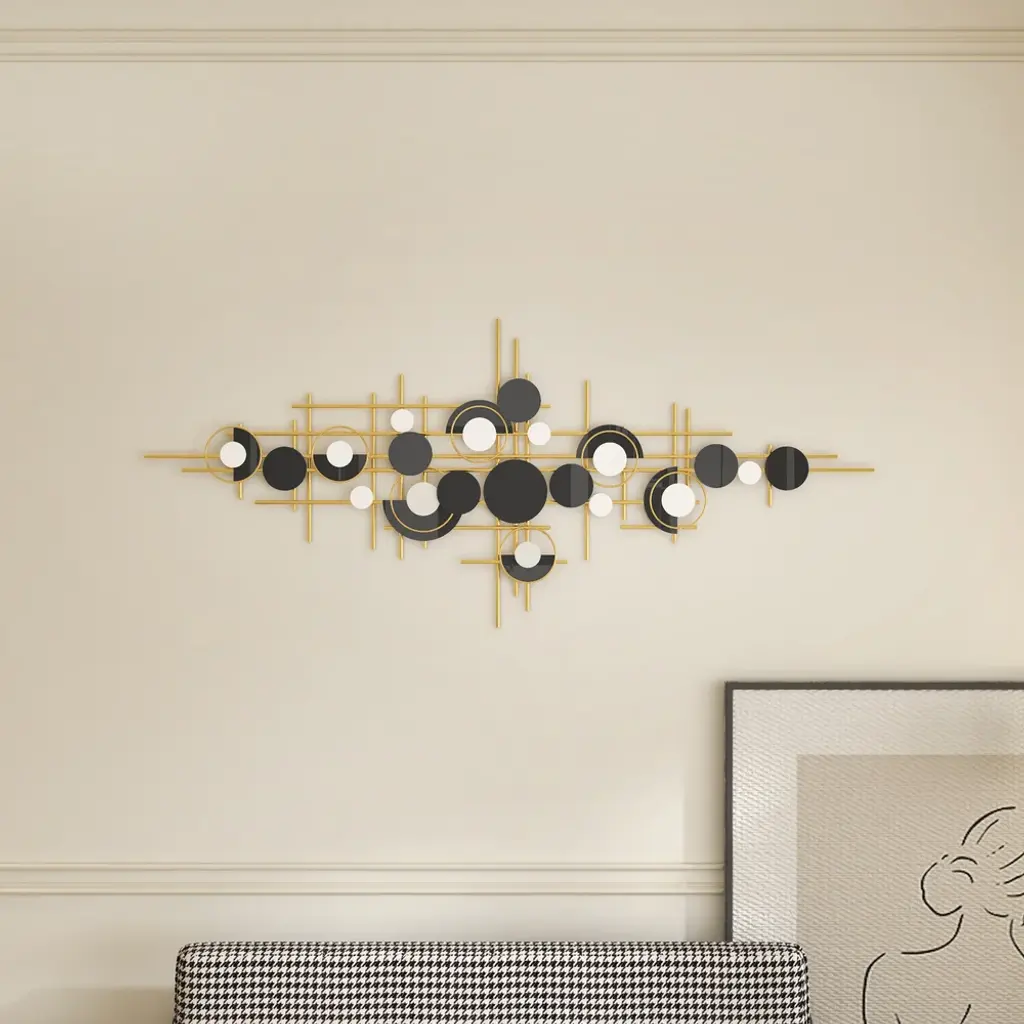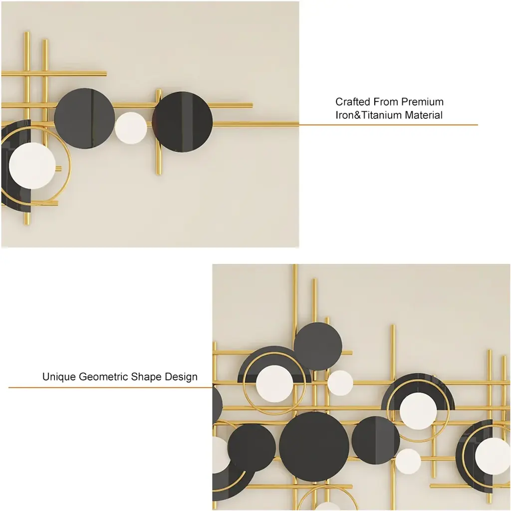 Bring a bold artistic statement to your walls with this modern geometric metal sculpture in gold and black. The layered circles and linear structure create depth and rhythm, adding dynamic elegance to your living room, dining room, or office.