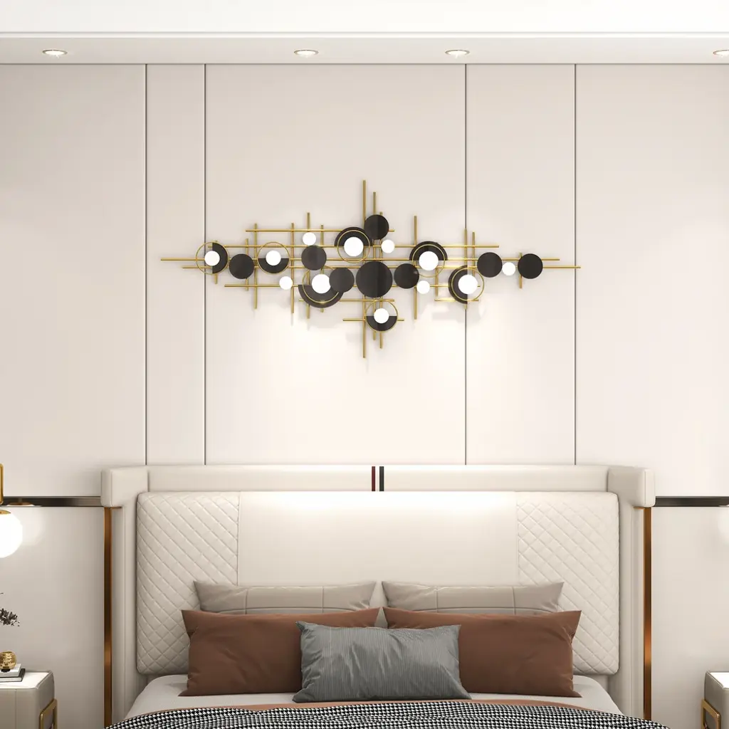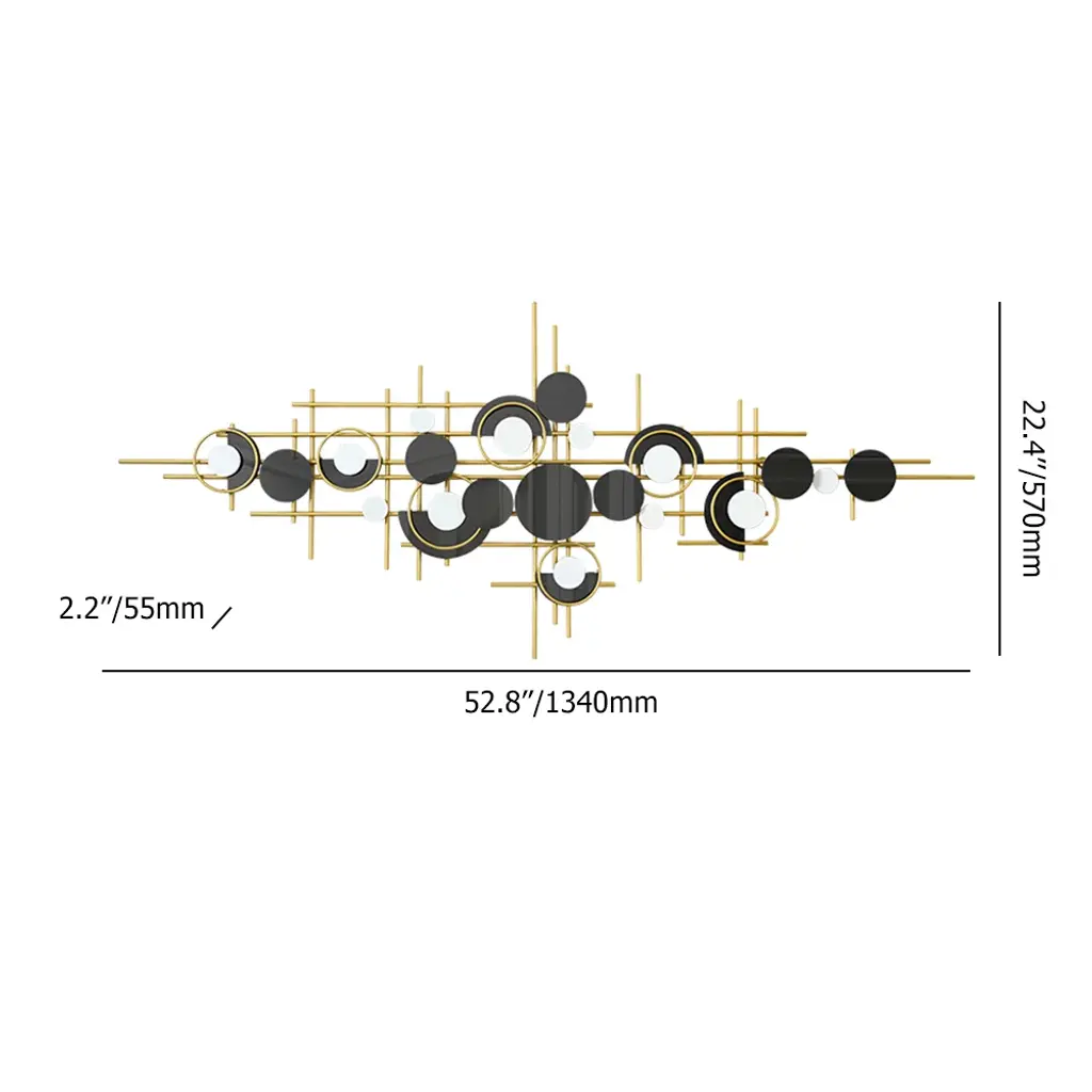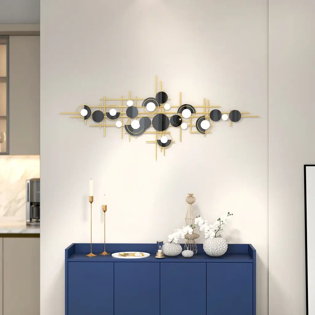 Bring a bold artistic statement to your walls with this modern geometric metal sculpture in gold and black. The layered circles and linear structure create depth and rhythm, adding dynamic elegance to your living room, dining room, or office.