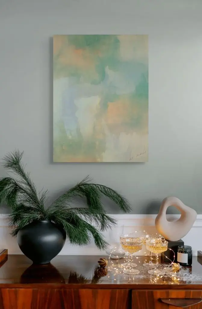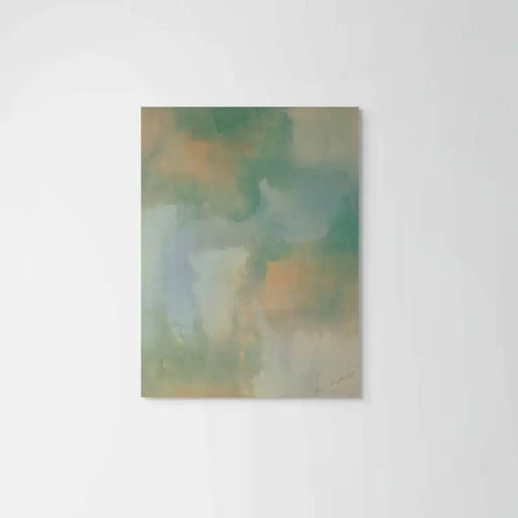 Original art from layered acrylics series. PRINT is digitally signed. Soft and warm tones of greens, golden yello, blue, beige/tan in a layered abstract style. WARM GARDEN is printed on archival canvas with .75" sides (mirror wrapped image). Size: 16" x 20" Ready to hang or frame (unframed - shown as example only). Limited edition print run. Exclusive to Chairish.