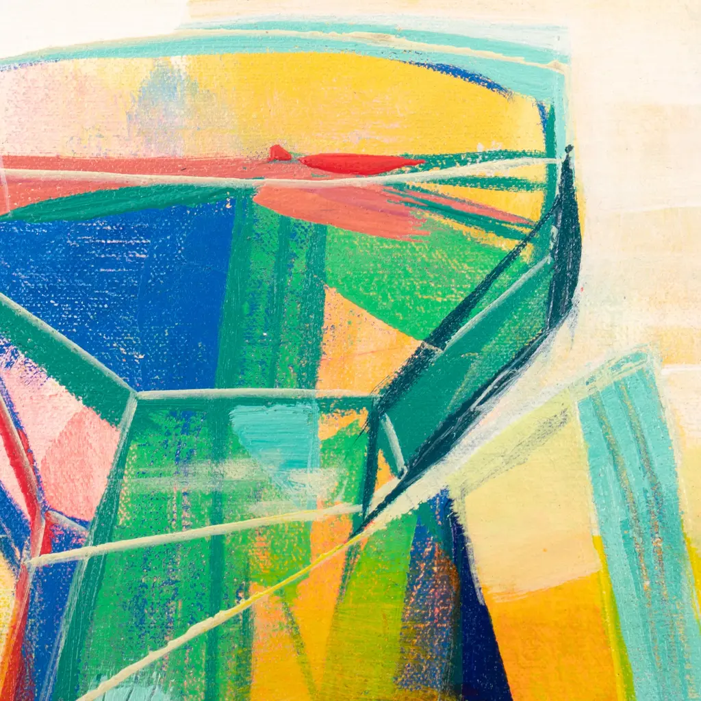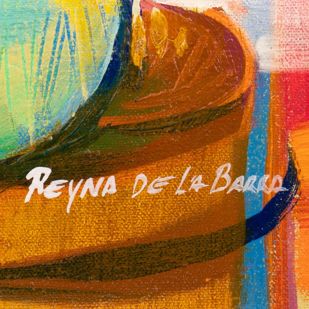 Peruvian artist Reyna de la Barra works with oil paints to craft a mesmerizing abstract still life filled with color and vibrancy. A pitcher takes center stage, created with loose brushstrokes, soft contours and rounded forms. Next to it, a wine glass boasts more angular shapes and defined contours. Finally, two fruits are arranged asymmetrically, adding dynamism to this extraordinary composition.Titled Una Jarra de Experiencias in Spanish.