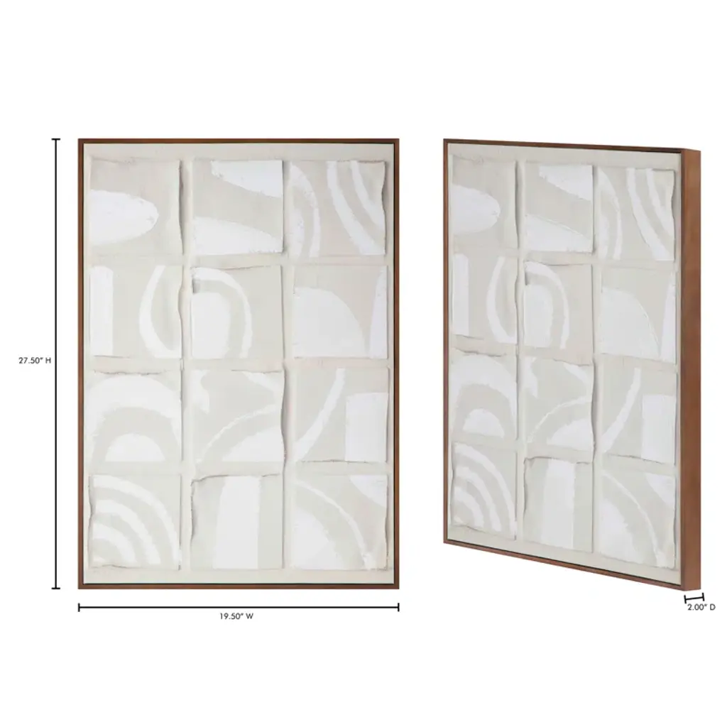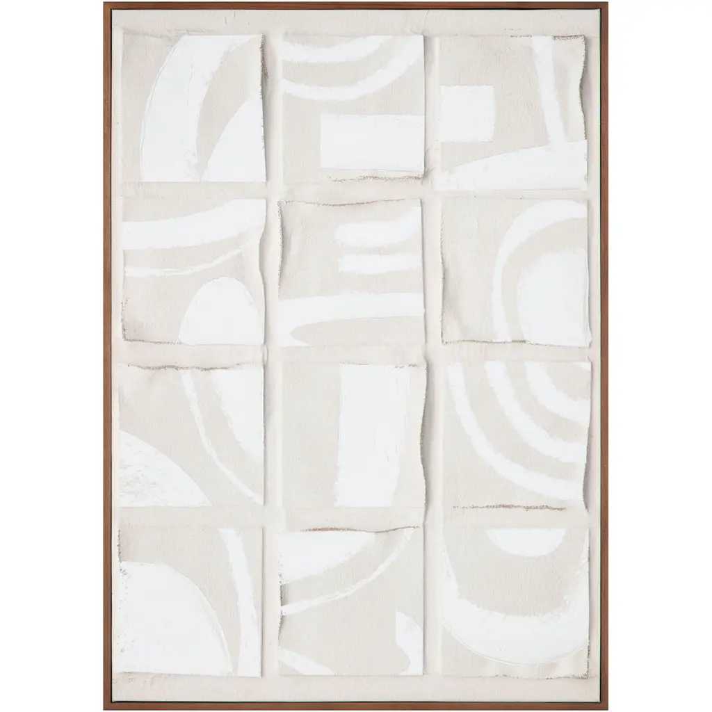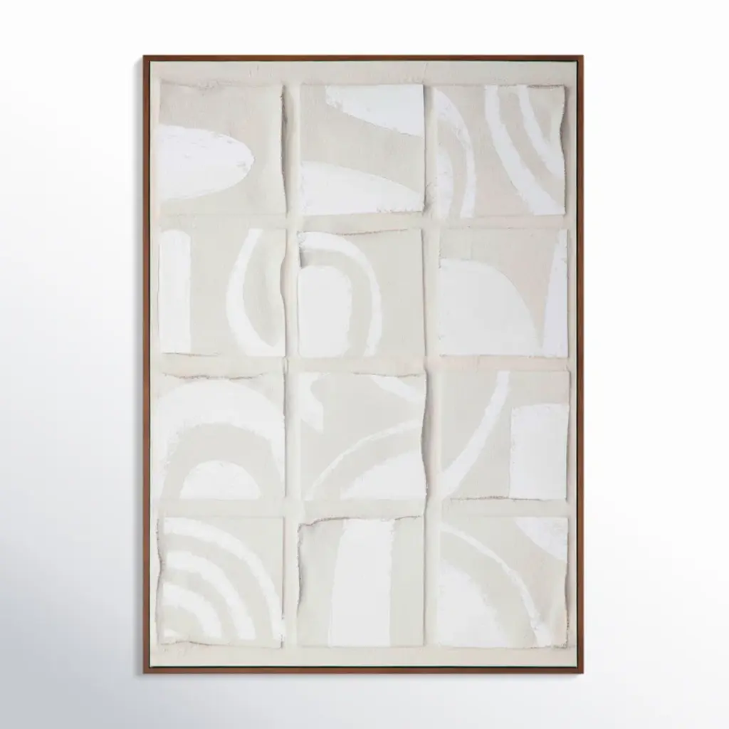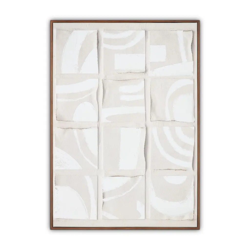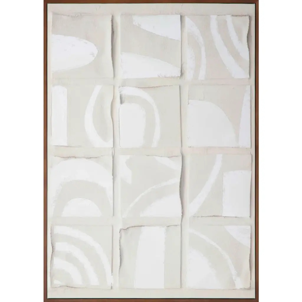 Inspired by the Dadaist movement and collage art, Unfold 1 is an homage to Ellsworth Kelly's "Cité," where ink strokes were brushed across a sheet of paper, cut into twenty squares, and randomly recomposed in a grid pattern. Shadowed tones add depth and dimension to the collage-like squares, while a neutral color palette and irregular shapes offer a softness to the sharp shapes—a remarkable abstract piece expertly finished with a solid pine frame.
