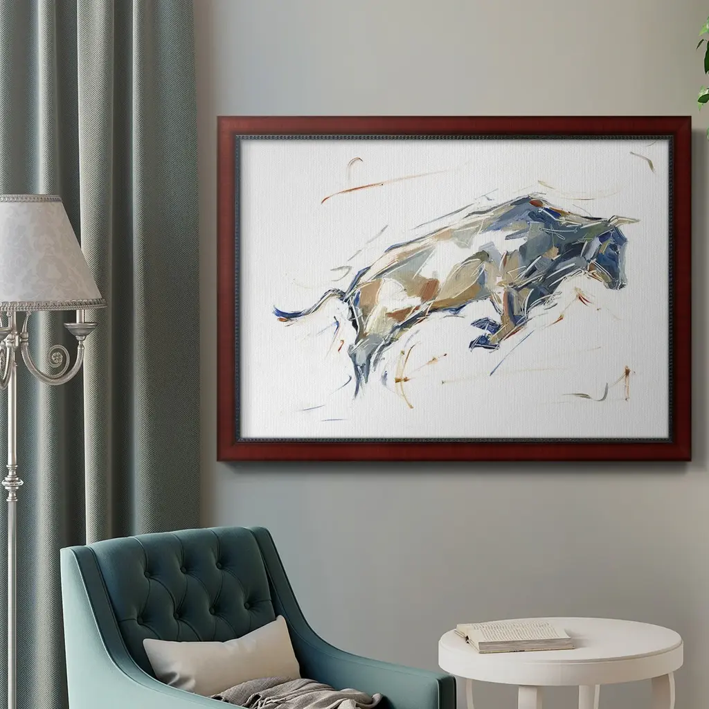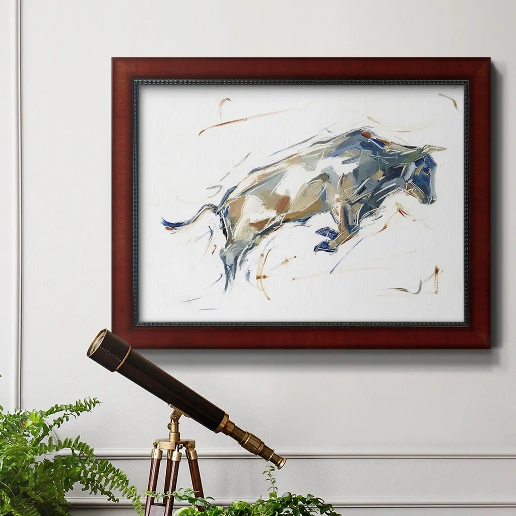 Modern Bull Study I Premium Framed Canvas- Ready to Hang A Premium Framed Canvas created to last. Framed in distressed wood and available in an array of sizes and colors Featuring a beveled a solid wood stretcher bar, each piece comes ready to hand 3 SIZES AVAILABLE 16''X20'' - Overall Size 18'X27'' - Overall Size 24''x36'' - Overall Size Each piece is made to order. Each piece comes with hanging hardware. Made in the USA Ready to Hang Giclee Paper Print Acrylic Glass Beveled Matt Board