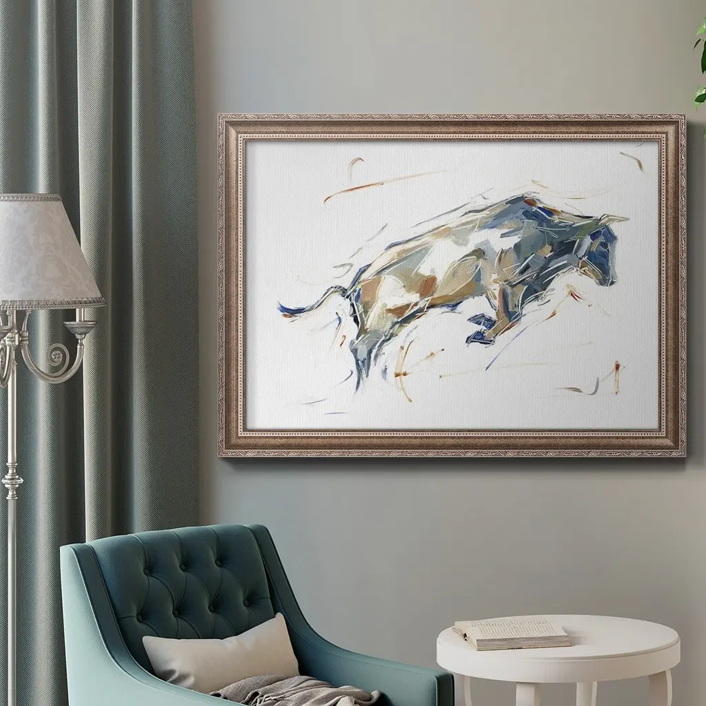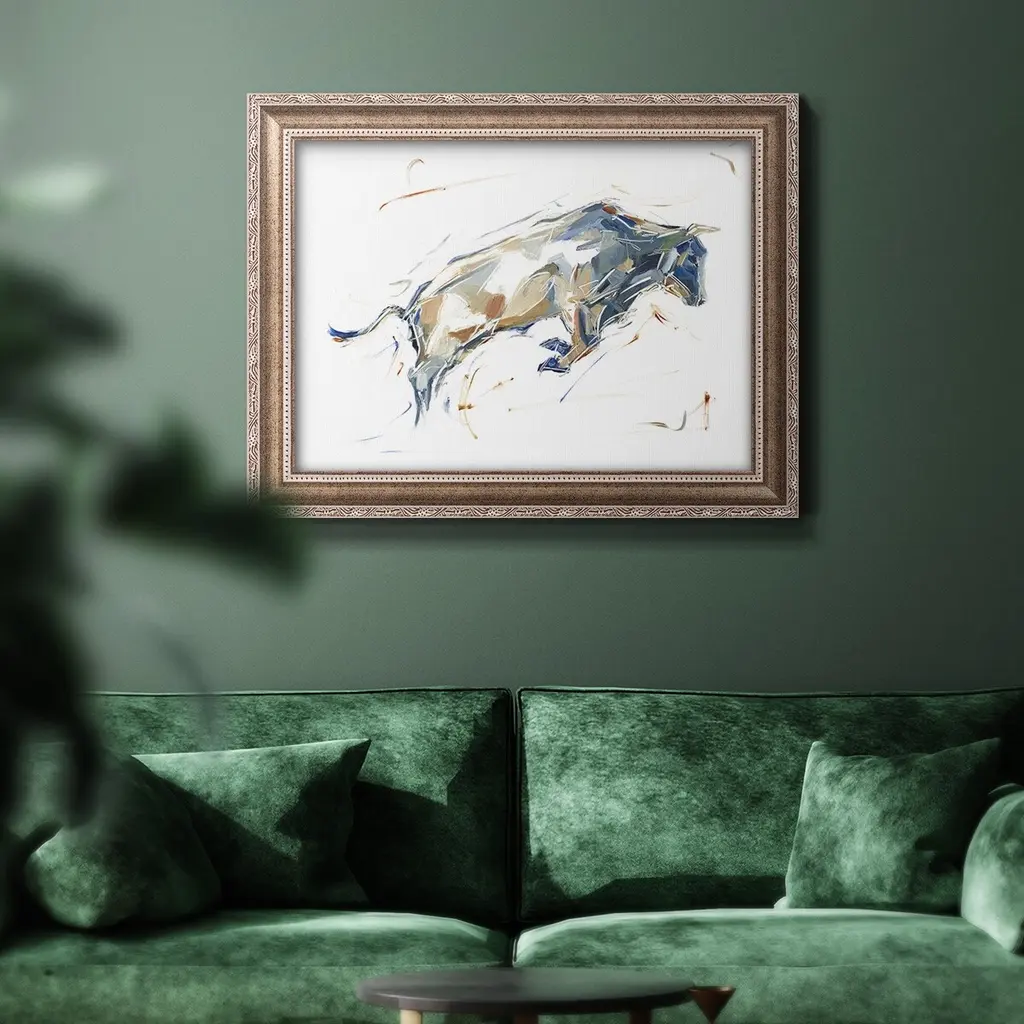 Modern Bull Study I Premium Framed Canvas- Ready to Hang A Premium Framed Canvas created to last. Framed in distressed wood and available in an array of sizes and colors Featuring a beveled a solid wood stretcher bar, each piece comes ready to hand 3 SIZES AVAILABLE 16''X20'' - Overall Size 18'X27'' - Overall Size 24''x36'' - Overall Size Each piece is made to order. Each piece comes with hanging hardware. Made in the USA Ready to Hang Giclee Paper Print Acrylic Glass Beveled Matt Board