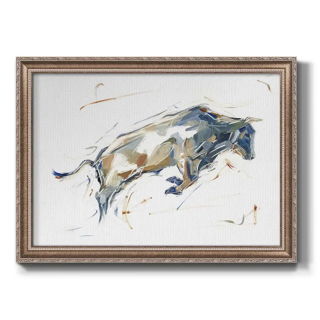 Modern Bull Study I Premium Framed Canvas- Ready to Hang A Premium Framed Canvas created to last. Framed in distressed wood and available in an array of sizes and colors Featuring a beveled a solid wood stretcher bar, each piece comes ready to hand 3 SIZES AVAILABLE 16''X20'' - Overall Size 18'X27'' - Overall Size 24''x36'' - Overall Size Each piece is made to order. Each piece comes with hanging hardware. Made in the USA Ready to Hang Giclee Paper Print Acrylic Glass Beveled Matt Board