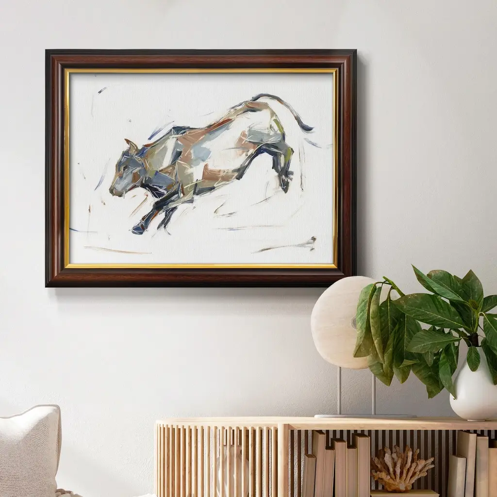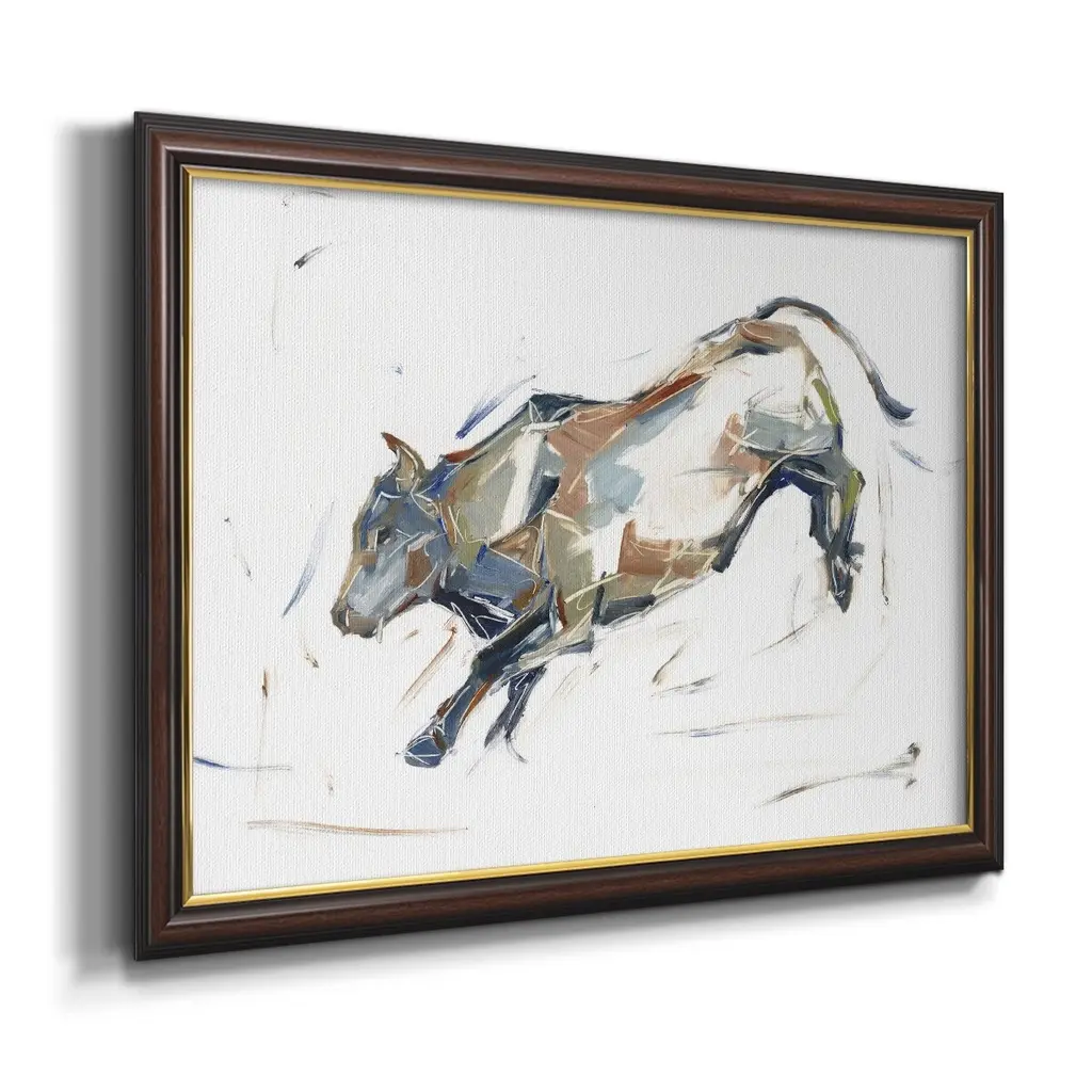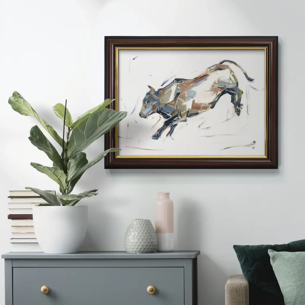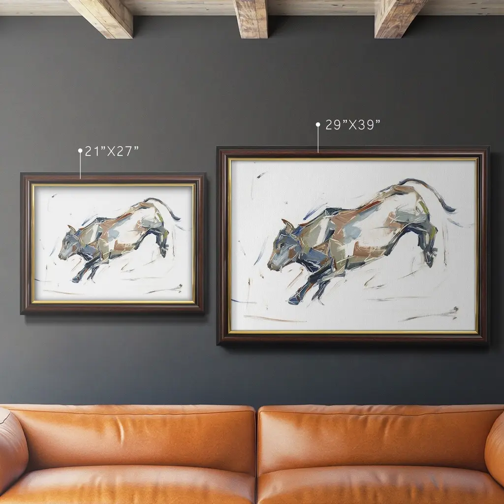 Modern Bull Study II Premium Framed Canvas- Ready to Hang A Premium Framed Canvas created to last. Framed in distressed wood and available in an array of sizes and colors Featuring a beveled a solid wood stretcher bar, each piece comes ready to hand 3 SIZES AVAILABLE 16''X20'' - Overall Size 18'X27'' - Overall Size 24''x36'' - Overall Size Each piece is made to order. Each piece comes with hanging hardware. Made in the USA Ready to Hang Giclee Paper Print Acrylic Glass Beveled Matt Board