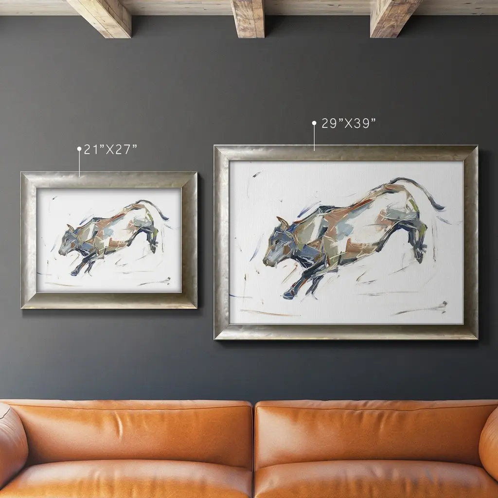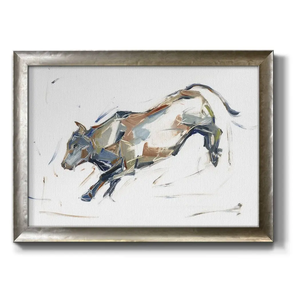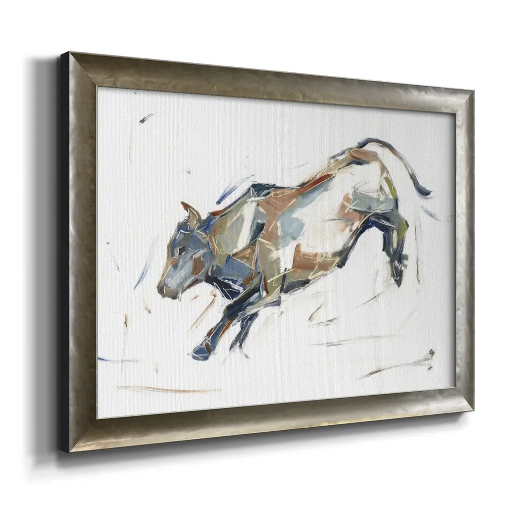Modern Bull Study II Premium Framed Canvas- Ready to Hang A Premium Framed Canvas created to last. Framed in distressed wood and available in an array of sizes and colors Featuring a beveled a solid wood stretcher bar, each piece comes ready to hand 3 SIZES AVAILABLE 16''X20'' - Overall Size 18'X27'' - Overall Size 24''x36'' - Overall Size Each piece is made to order. Each piece comes with hanging hardware. Made in the USA Ready to Hang Giclee Paper Print Acrylic Glass Beveled Matt Board