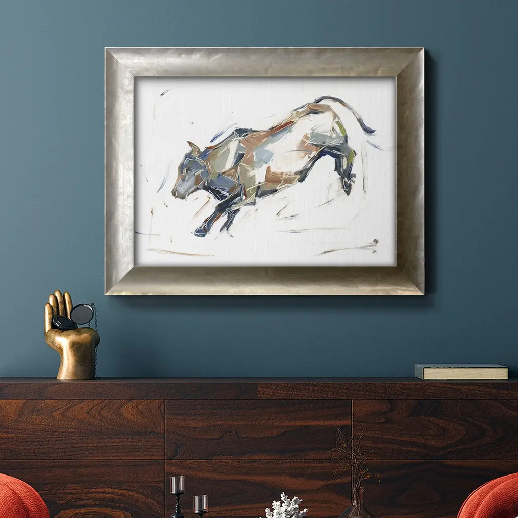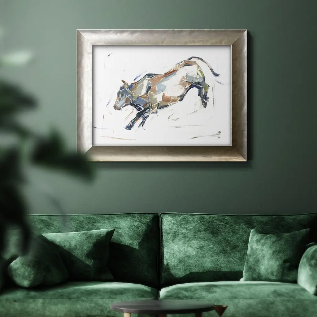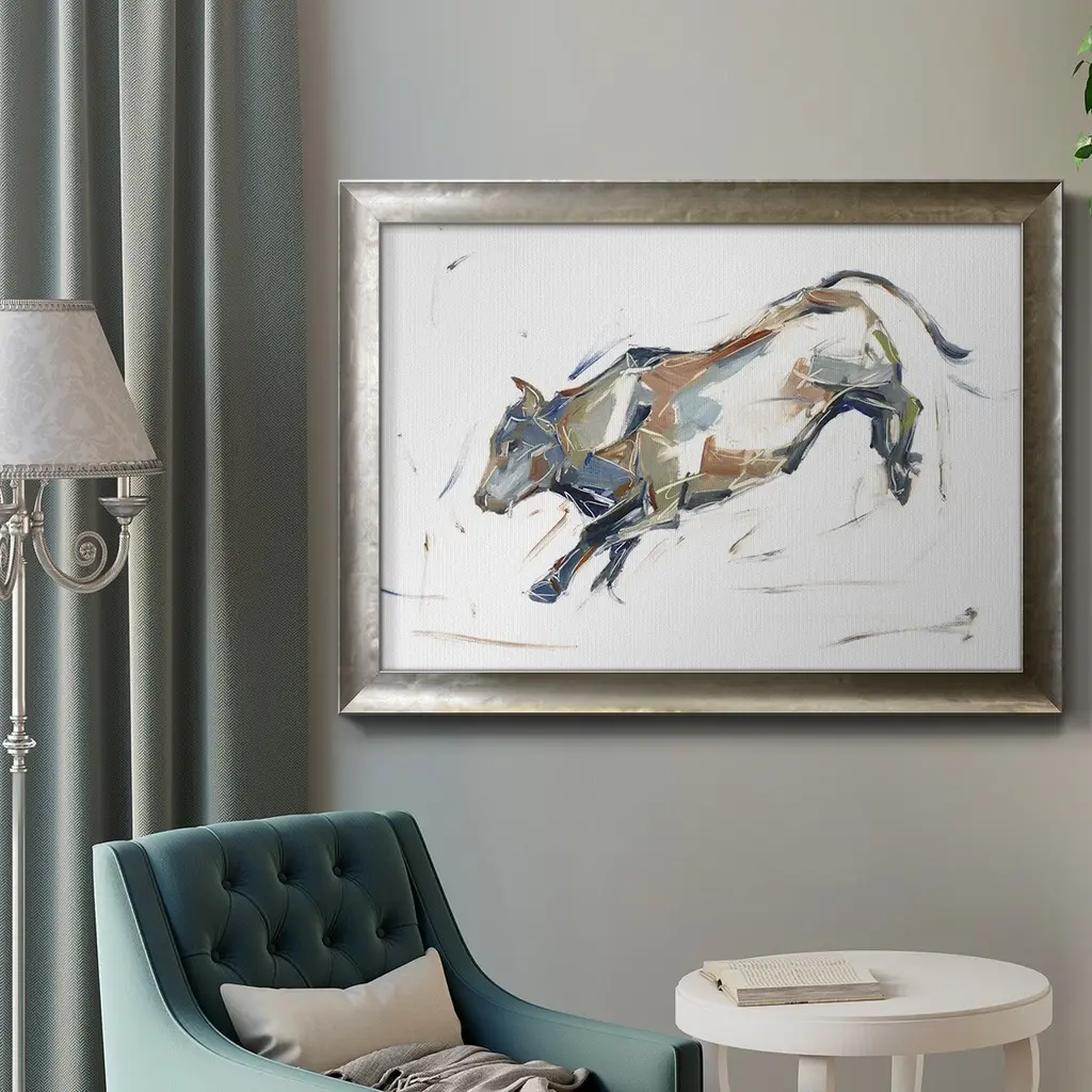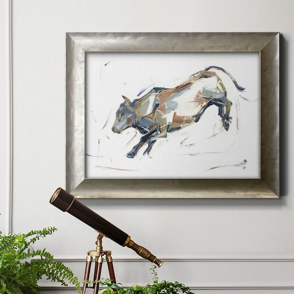 Modern Bull Study II Premium Framed Canvas- Ready to Hang A Premium Framed Canvas created to last. Framed in distressed wood and available in an array of sizes and colors Featuring a beveled a solid wood stretcher bar, each piece comes ready to hand 3 SIZES AVAILABLE 16''X20'' - Overall Size 18'X27'' - Overall Size 24''x36'' - Overall Size Each piece is made to order. Each piece comes with hanging hardware. Made in the USA Ready to Hang Giclee Paper Print Acrylic Glass Beveled Matt Board