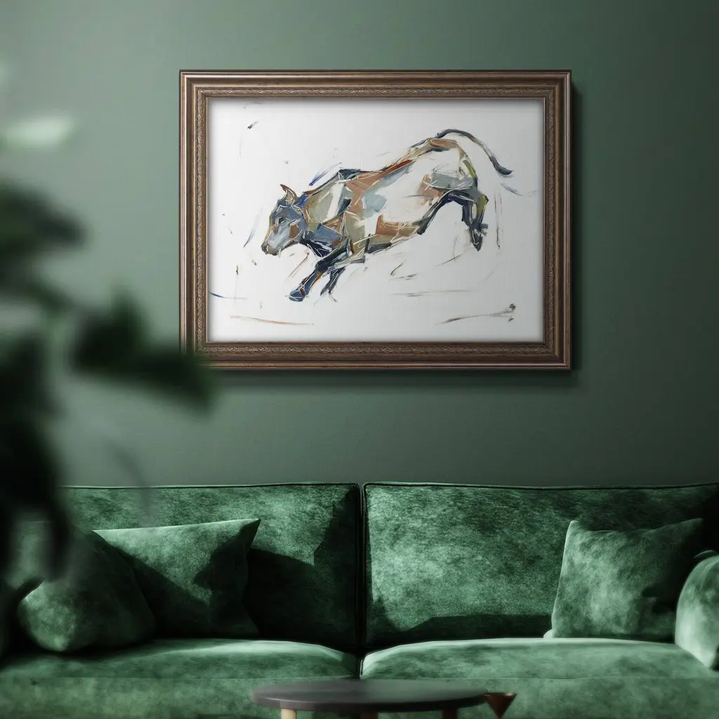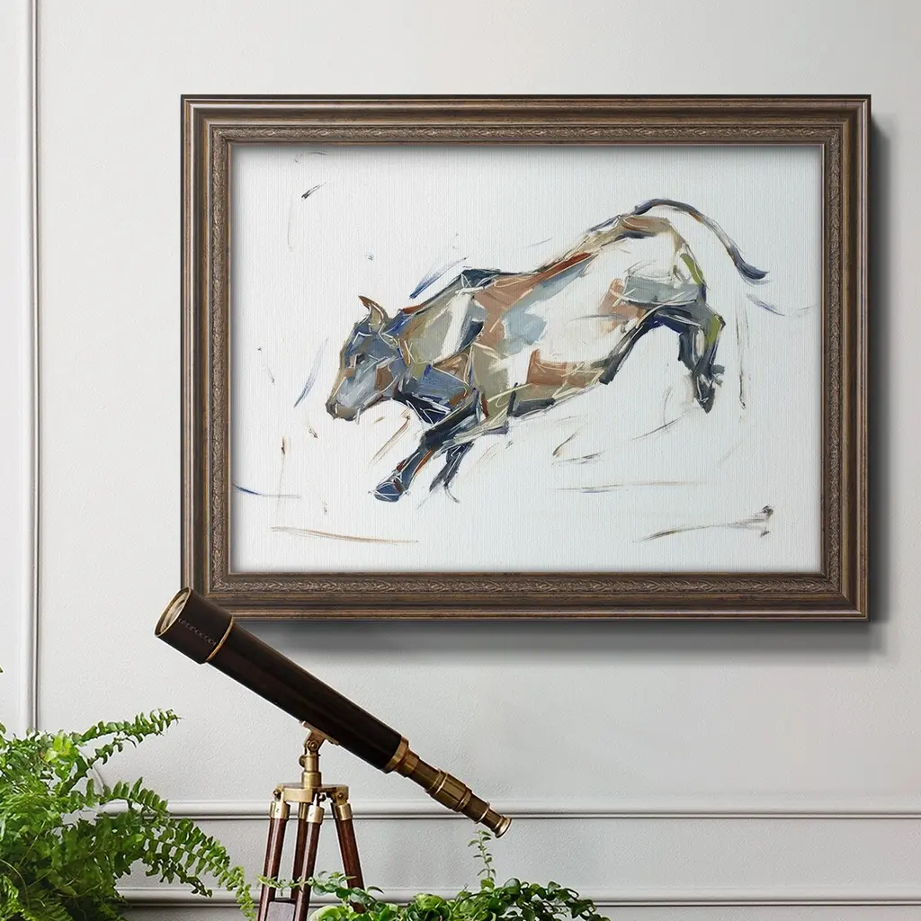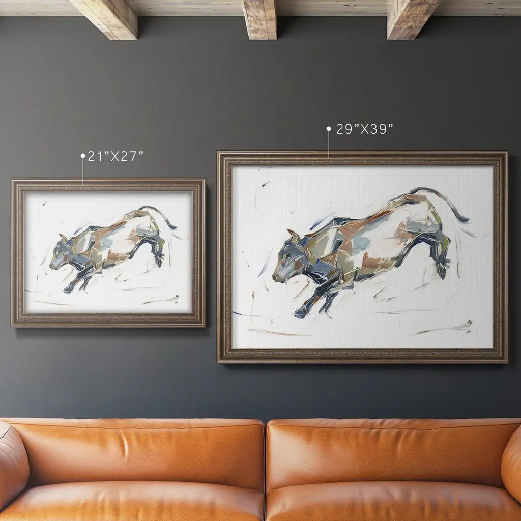 Modern Bull Study II Premium Framed Canvas- Ready to Hang A Premium Framed Canvas created to last. Framed in distressed wood and available in an array of sizes and colors Featuring a beveled a solid wood stretcher bar, each piece comes ready to hand 3 SIZES AVAILABLE 16''X20'' - Overall Size 18'X27'' - Overall Size 24''x36'' - Overall Size Each piece is made to order. Each piece comes with hanging hardware. Made in the USA Ready to Hang Giclee Paper Print Acrylic Glass Beveled Matt Board