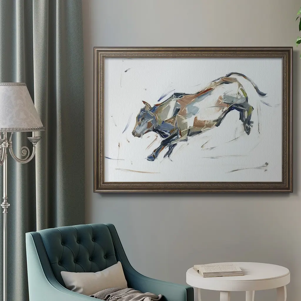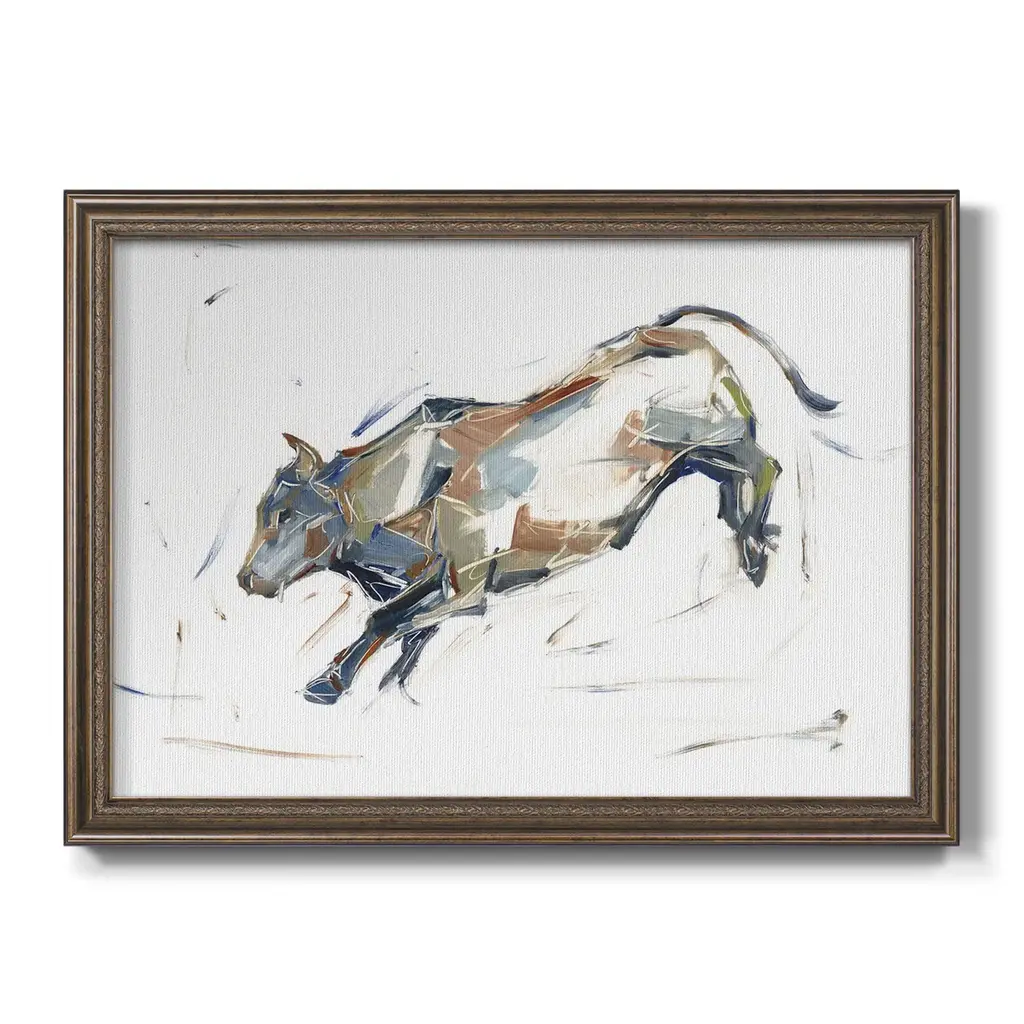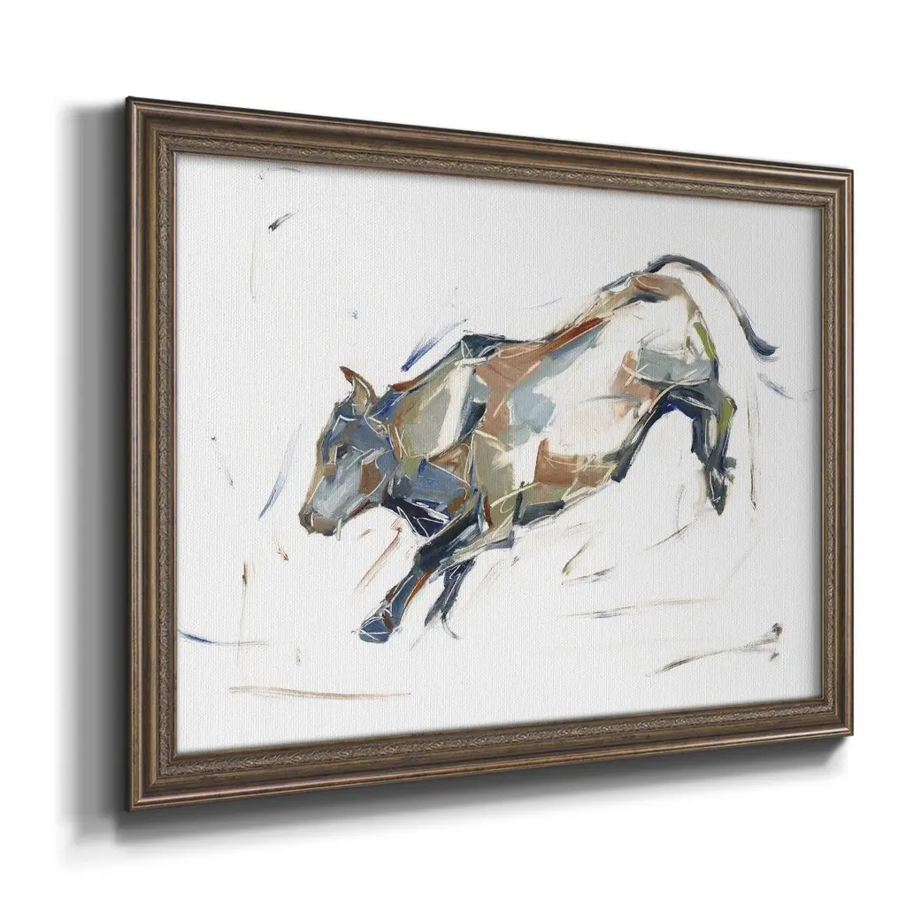 Modern Bull Study II Premium Framed Canvas- Ready to Hang A Premium Framed Canvas created to last. Framed in distressed wood and available in an array of sizes and colors Featuring a beveled a solid wood stretcher bar, each piece comes ready to hand 3 SIZES AVAILABLE 16''X20'' - Overall Size 18'X27'' - Overall Size 24''x36'' - Overall Size Each piece is made to order. Each piece comes with hanging hardware. Made in the USA Ready to Hang Giclee Paper Print Acrylic Glass Beveled Matt Board