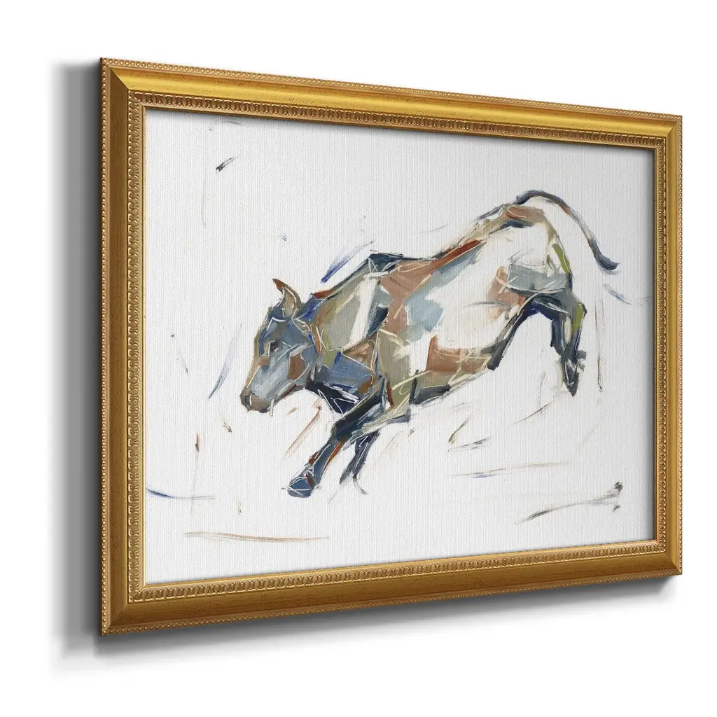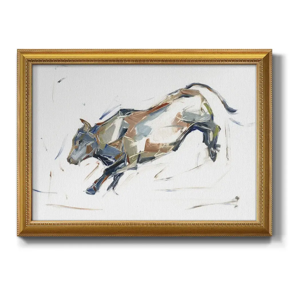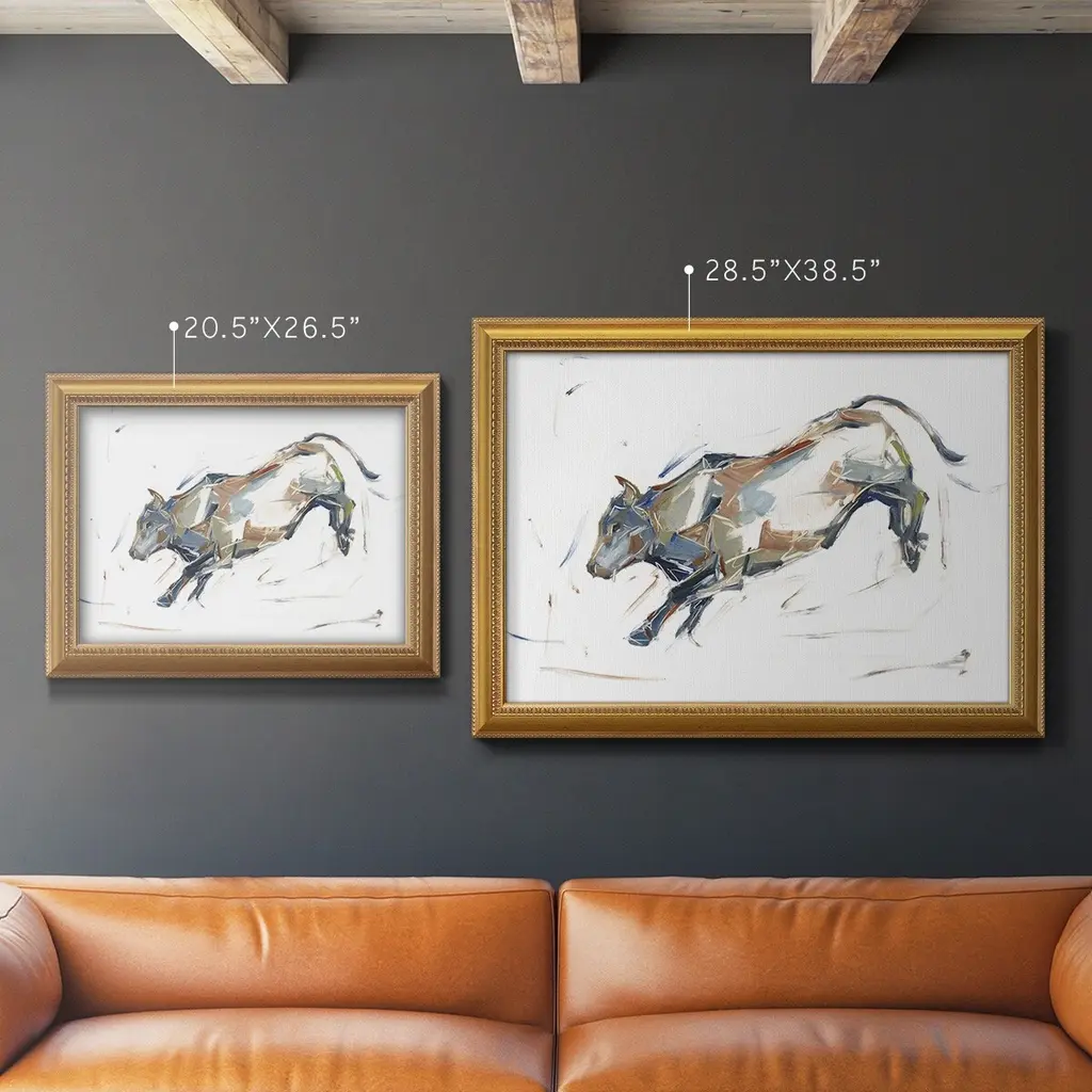 Modern Bull Study II Premium Framed Canvas- Ready to Hang A Premium Framed Canvas created to last. Framed in distressed wood and available in an array of sizes and colors Featuring a beveled a solid wood stretcher bar, each piece comes ready to hand 3 SIZES AVAILABLE 16''X20'' - Overall Size 18'X27'' - Overall Size 24''x36'' - Overall Size Each piece is made to order. Each piece comes with hanging hardware. Made in the USA Ready to Hang Giclee Paper Print Acrylic Glass Beveled Matt Board