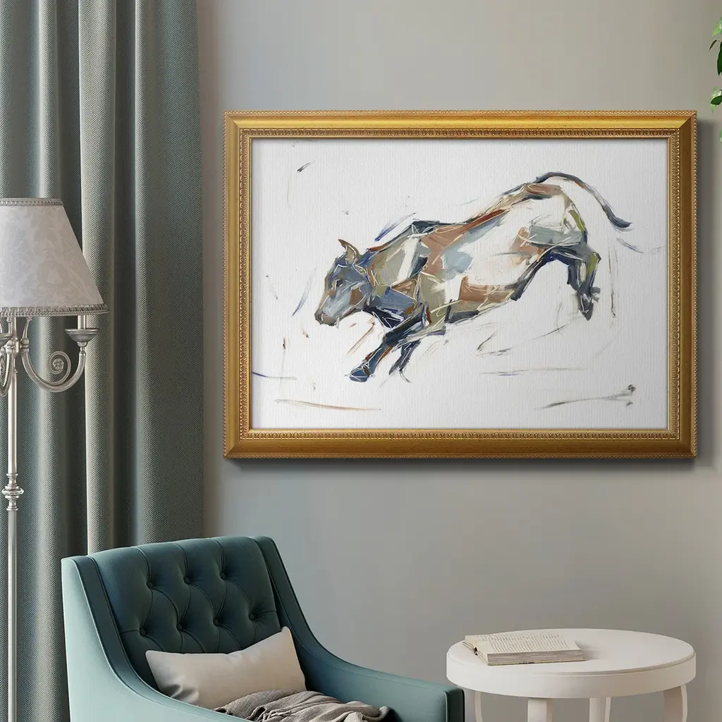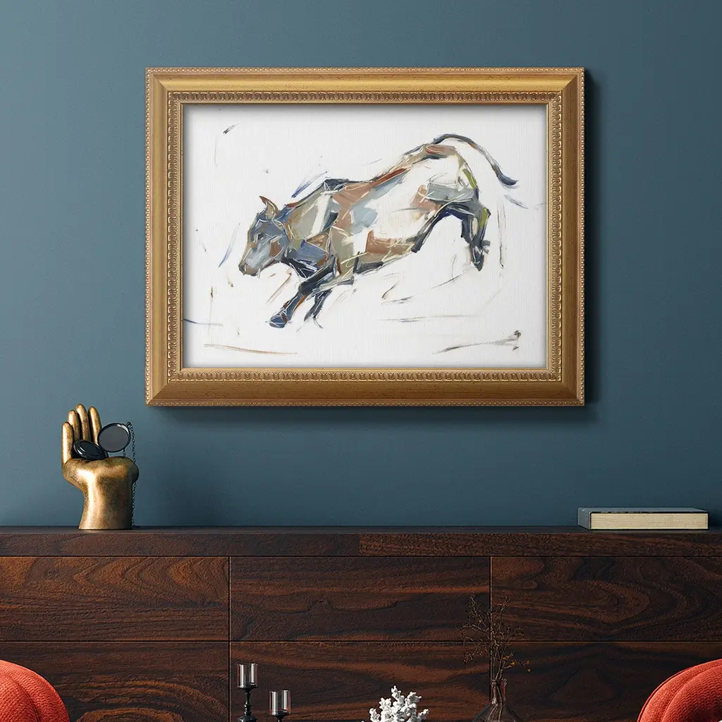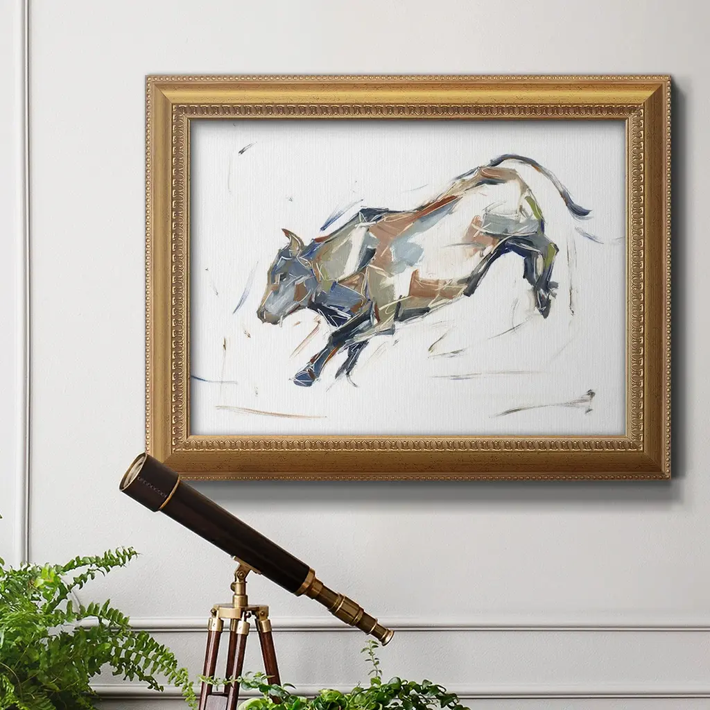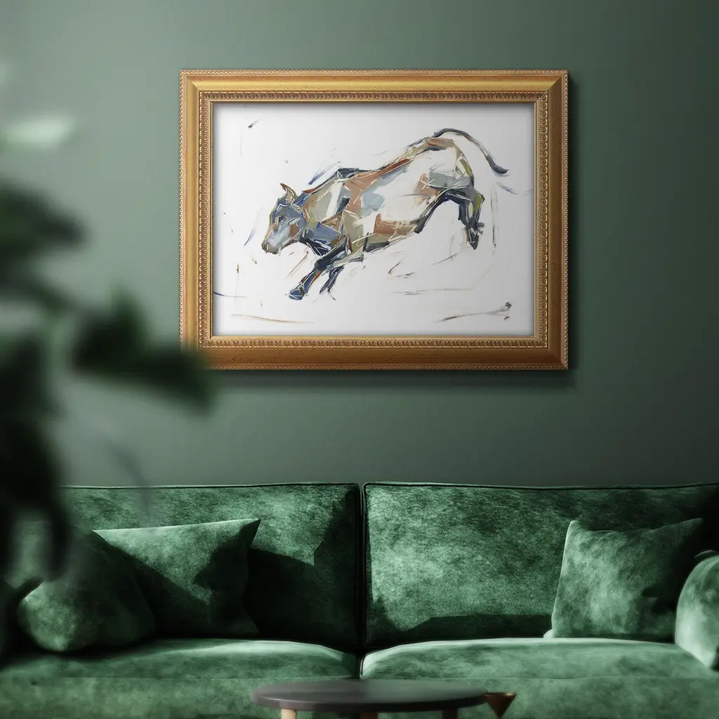 Modern Bull Study II Premium Framed Canvas- Ready to Hang A Premium Framed Canvas created to last. Framed in distressed wood and available in an array of sizes and colors Featuring a beveled a solid wood stretcher bar, each piece comes ready to hand 3 SIZES AVAILABLE 16''X20'' - Overall Size 18'X27'' - Overall Size 24''x36'' - Overall Size Each piece is made to order. Each piece comes with hanging hardware. Made in the USA Ready to Hang Giclee Paper Print Acrylic Glass Beveled Matt Board