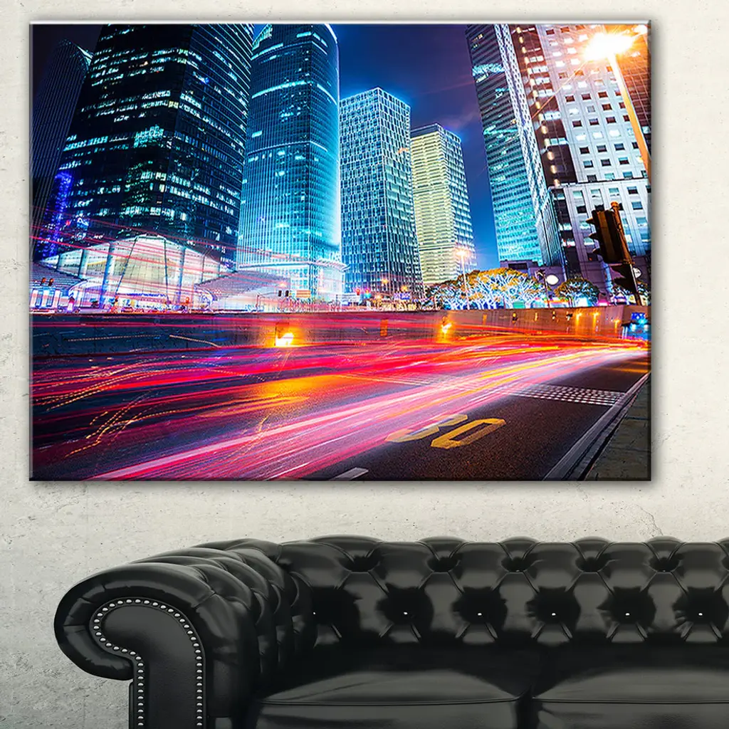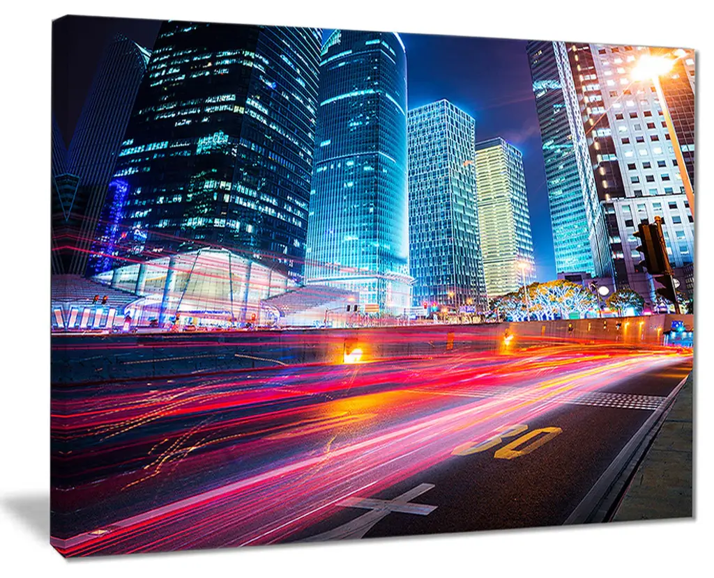 The Modern City Night Scene canvas art print is sure to make an impression on anyone who sees it. This artwork is gallery wrapped around a 1-inch solid wood frame and arrives carefully packaged and entirely ready to hang on the wall. Design Art only uses the highest resolution and pigments to ensure a crisp colorful print that is never faded or pixelated. This artwork is sure to be a conversation starter in any home or office.