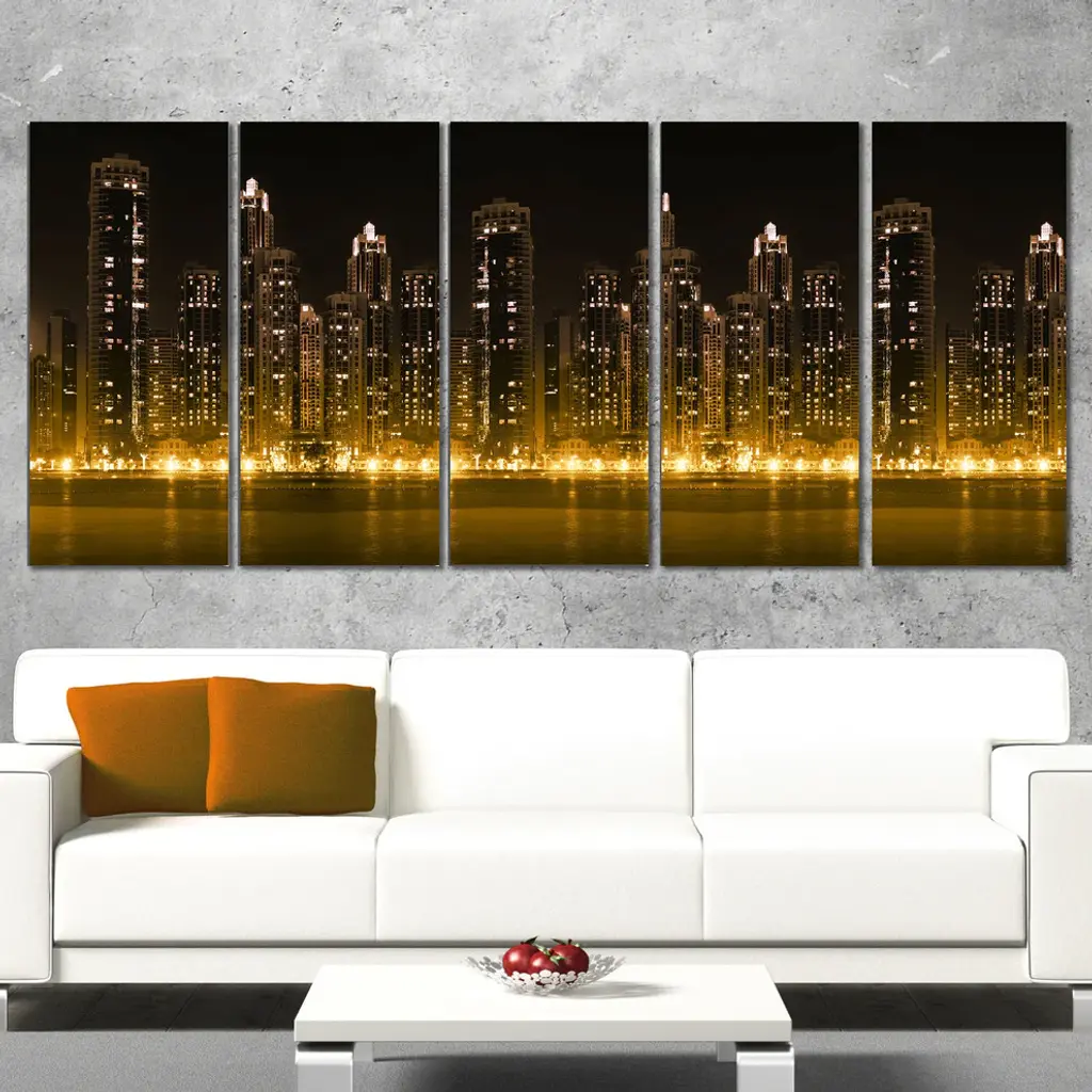 "Modern City With Illuminated Skyscrapers" Wall Art, 60"x28", 5-Panels