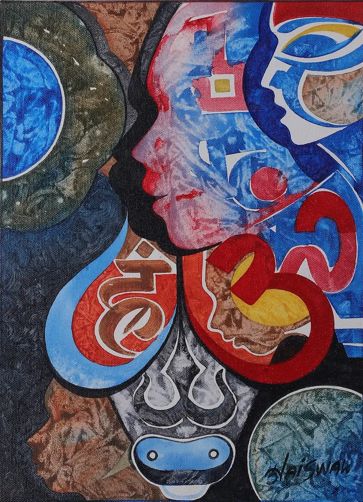 Exalting the oneness of all living creatures, Sunil Jaiswal works in a palette of brilliant, textured colors. A human centers the canvas, observed close up by a gentle bird. Beneath, golden fish glide past.