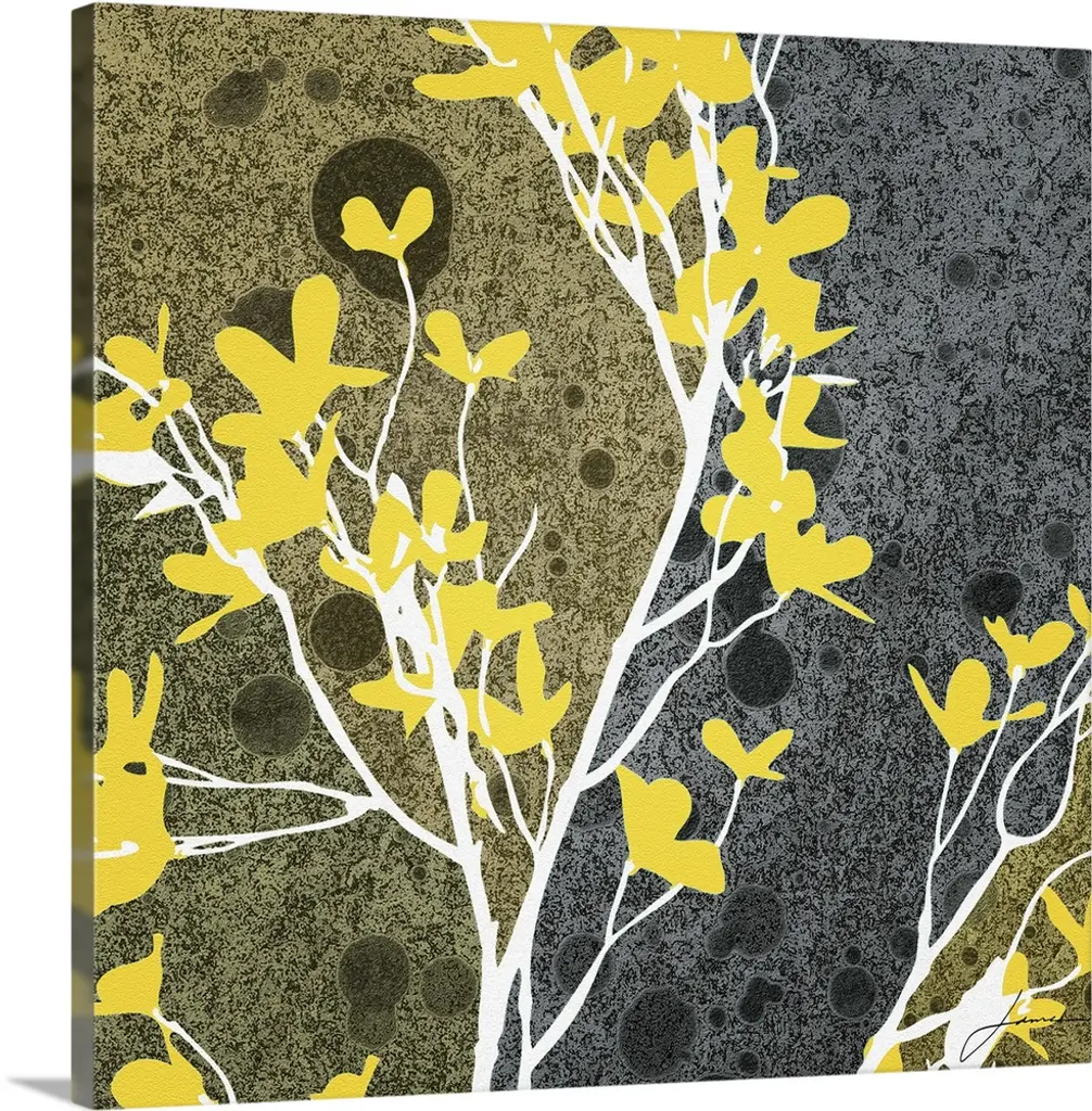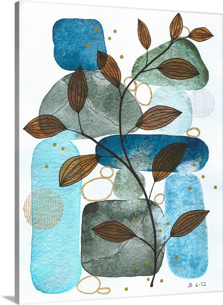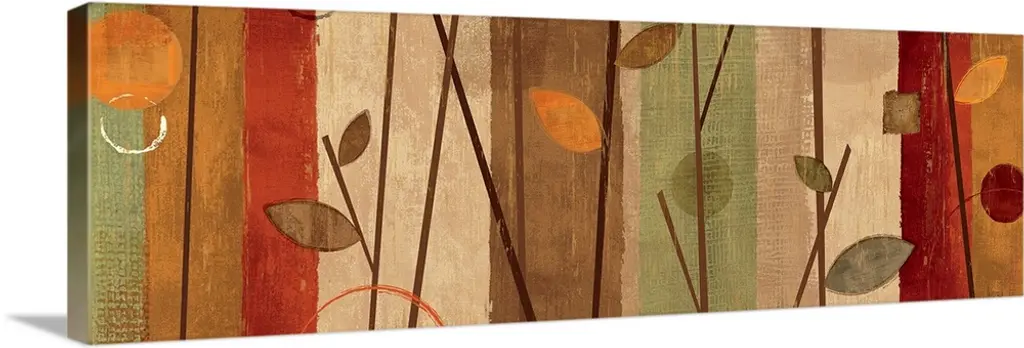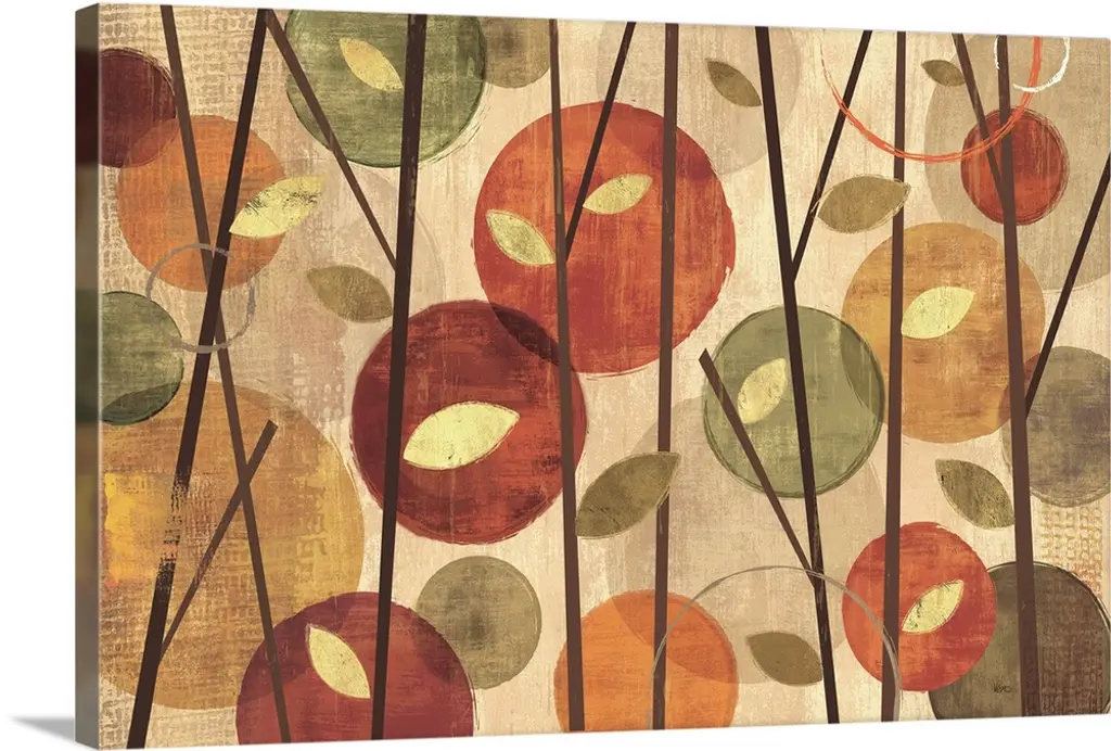 Contemporary artwork of a forest of thin trees with broad leaves embellished with circular shapes.