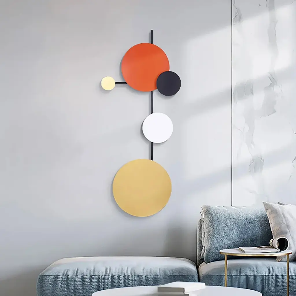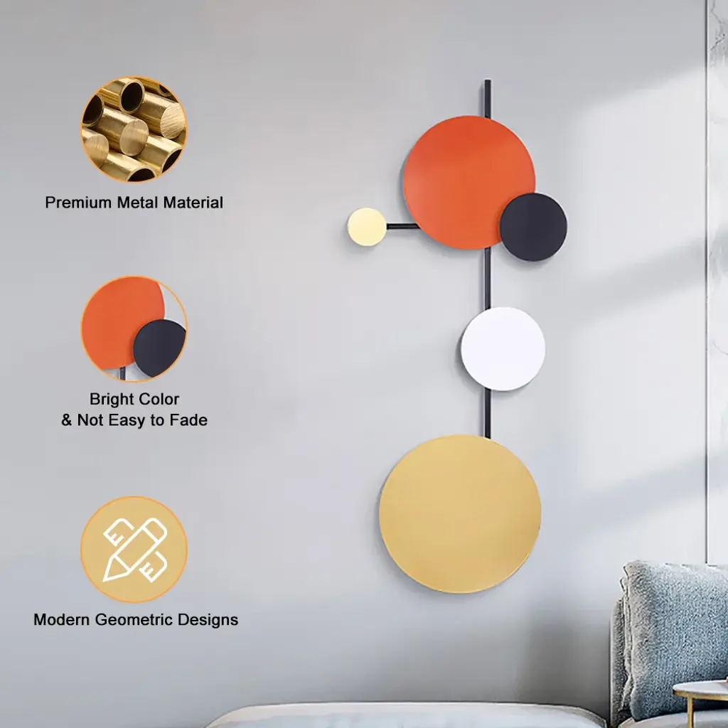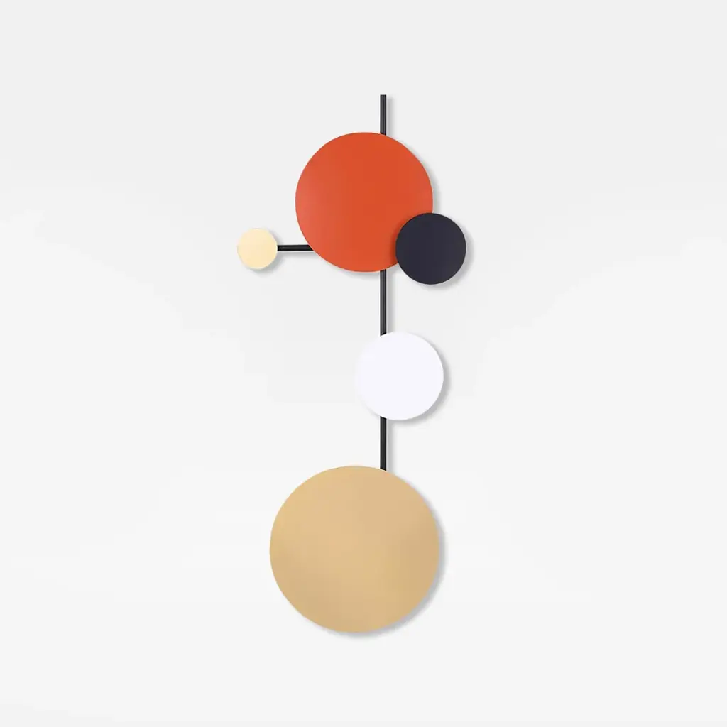 Add a dash of visual intrigue and stylish sophistication to your ensemble with this eye-catching wall decor, the perfect piece for your well-curated aesthetic. It is crafted from iron and adopts a 3D iron art design, featuring colorful geometric rounds that are connected by black iron bars. The overall design brings a minimalist contemporary fashion art sense.