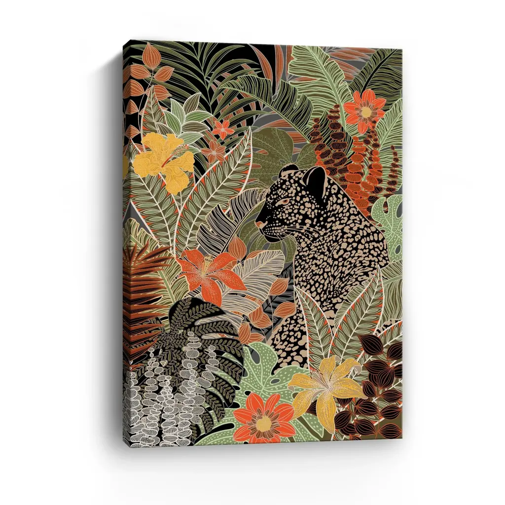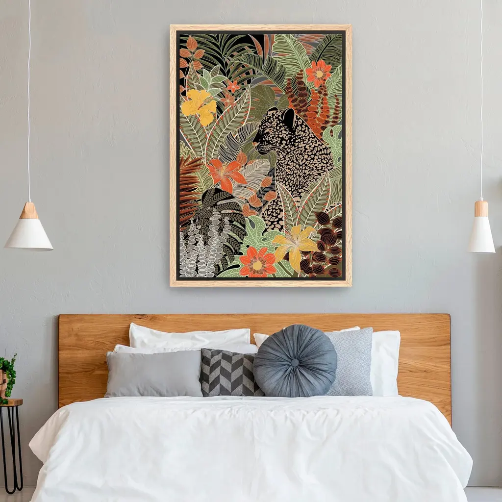 Immerse yourself in the beauty of nature with this captivating forest canvas art print, featuring a vibrant yet muted palette. This artwork brings to life the enchanting atmosphere of a lush forest, complete with intricate details that invite you to explore its depths. At the heart of the composition, a majestic leopard blends seamlessly into the scenery, symbolizing the harmony of wildlife within its vibrant habitat.Available in black frame, dark walnut frame and oak frames, or as a frameless canvas. Our Gallery Wrap Canvas Prints are proudly assembled with high quality materials in California, USA. Each piece is printed on a thick, archival grade canvas using Giclee technology. It is then hand-stretched by our experienced artisans over solid pine bars, which will not warp over time. The final product is a piece personally crafted for you to confidently display on your wall. Care and Assembly: Ensure that the location of your piece has little to no exposure to heat, sunlight, and moisture. Wipe clean, only if needed. Each piece includes a sawtooth hanger to hang on your wall vertically.