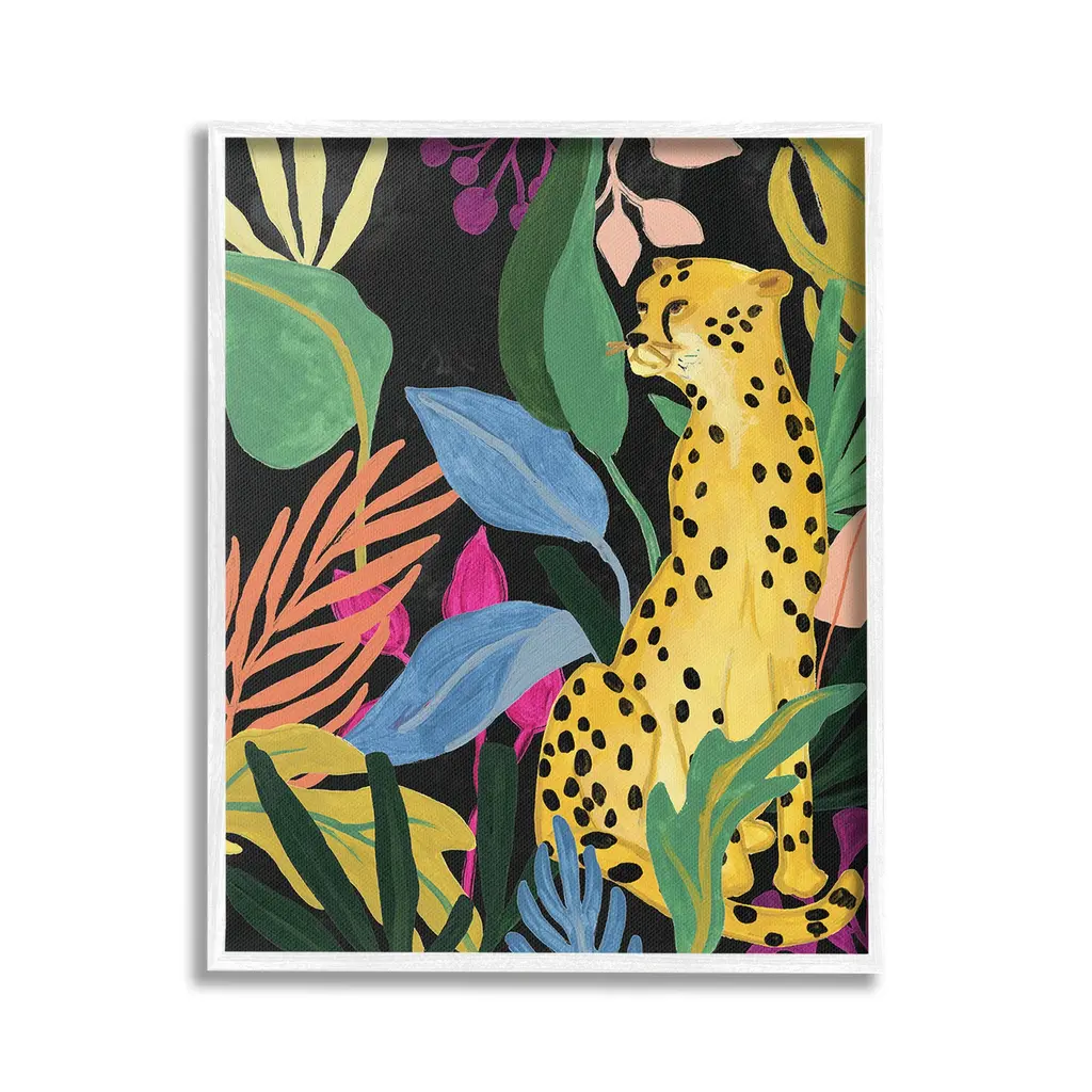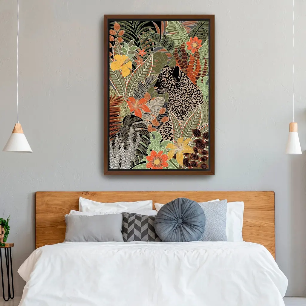 Immerse yourself in the beauty of nature with this captivating forest canvas art print, featuring a vibrant yet muted palette. This artwork brings to life the enchanting atmosphere of a lush forest, complete with intricate details that invite you to explore its depths. At the heart of the composition, a majestic leopard blends seamlessly into the scenery, symbolizing the harmony of wildlife within its vibrant habitat.Available in black frame, dark walnut frame and oak frames, or as a frameless canvas. Our Gallery Wrap Canvas Prints are proudly assembled with high quality materials in California, USA. Each piece is printed on a thick, archival grade canvas using Giclee technology. It is then hand-stretched by our experienced artisans over solid pine bars, which will not warp over time. The final product is a piece personally crafted for you to confidently display on your wall. Care and Assembly: Ensure that the location of your piece has little to no exposure to heat, sunlight, and moisture. Wipe clean, only if needed. Each piece includes a sawtooth hanger to hang on your wall vertically.