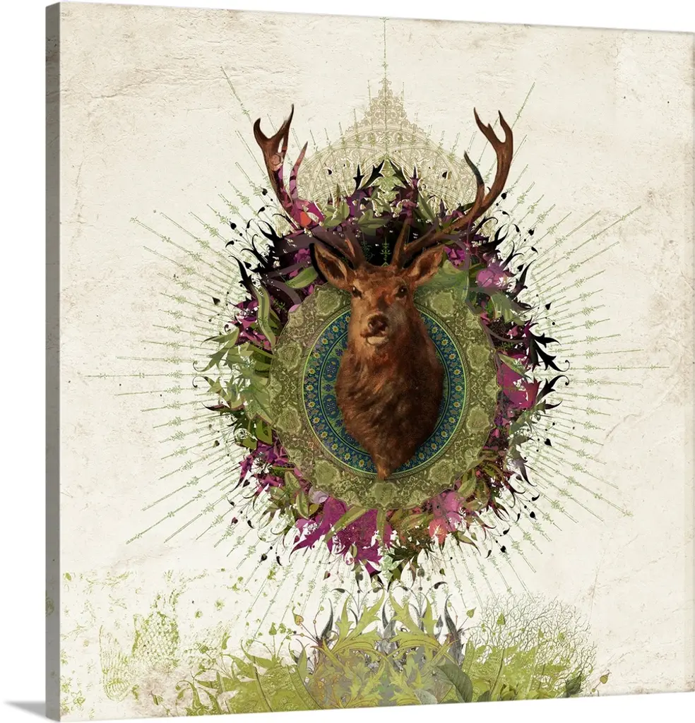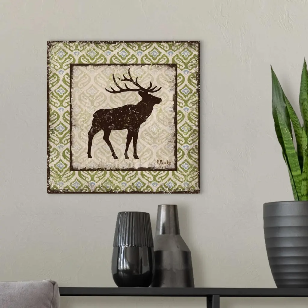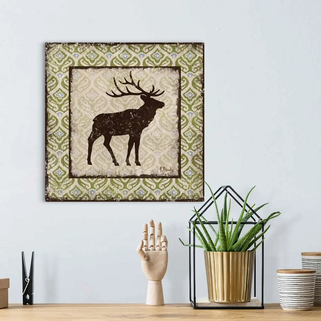 Decorative square artwork featuring a silhouetted elk on a boho pattern.