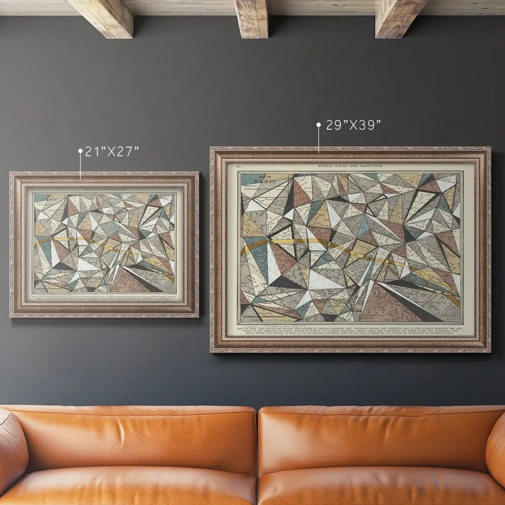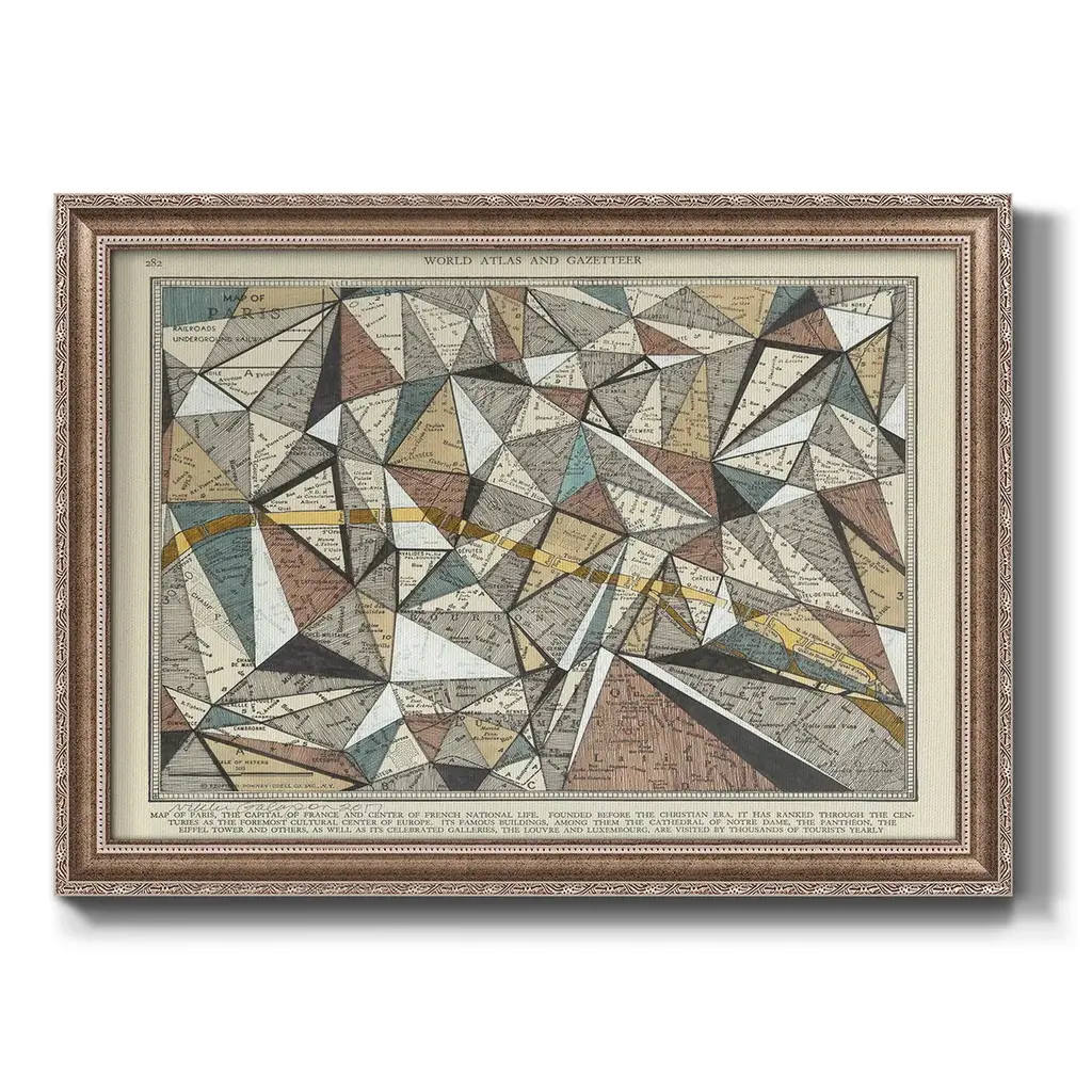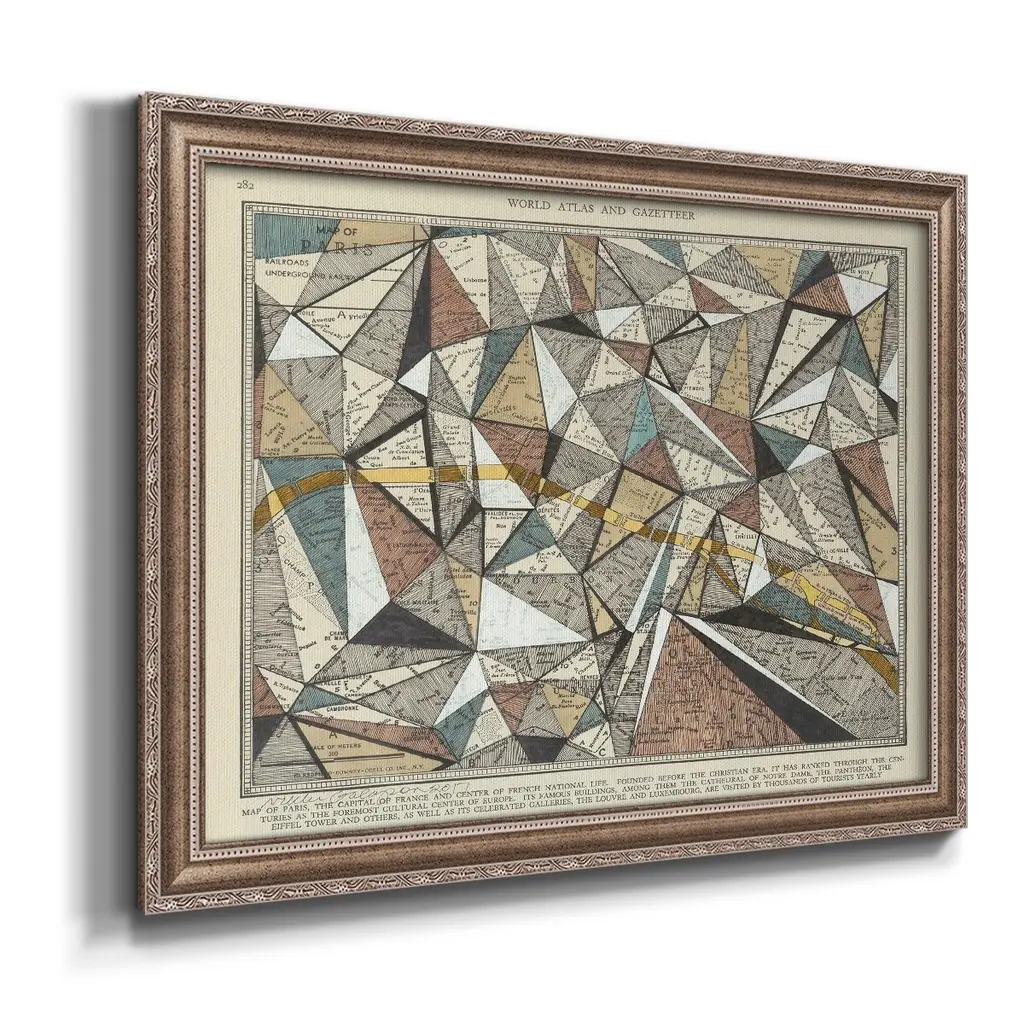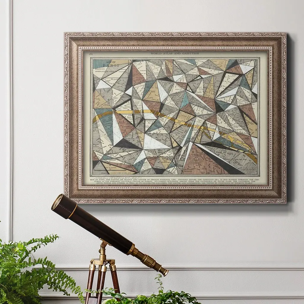 Modern Map of Paris Premium Framed Canvas- Ready to Hang A Premium Framed Canvas created to last. Framed in distressed wood and available in an array of sizes and colors Featuring a beveled a solid wood stretcher bar, each piece comes ready to hand 3 SIZES AVAILABLE 16''X20'' - Overall Size 18'X27'' - Overall Size 24''x36'' - Overall Size Each piece is made to order. Each piece comes with hanging hardware. Made in the USA Ready to Hang Giclee Paper Print Acrylic Glass Beveled Matt Board