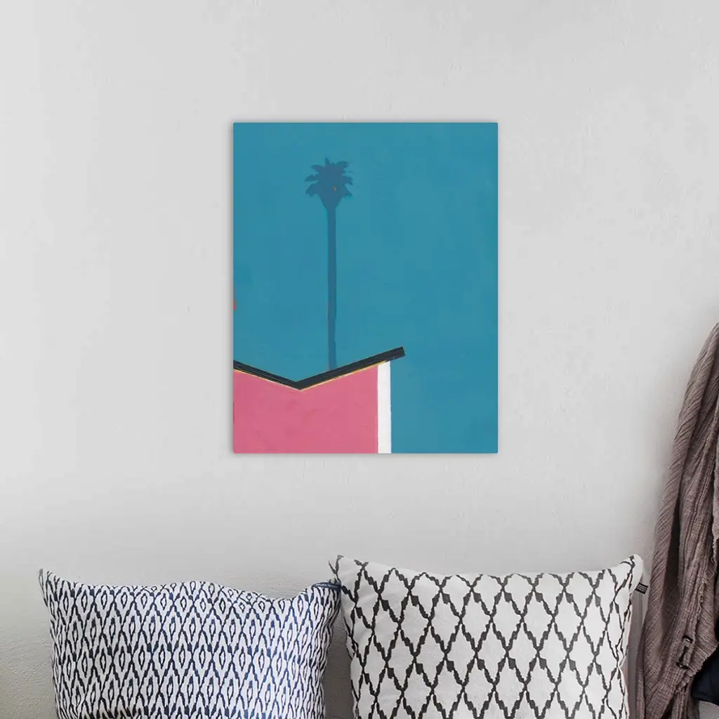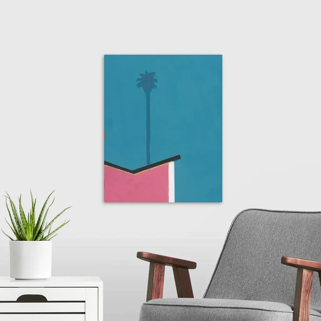 Modern painting of an angled rooftop with a single palm tree rising above it, on a blue background.