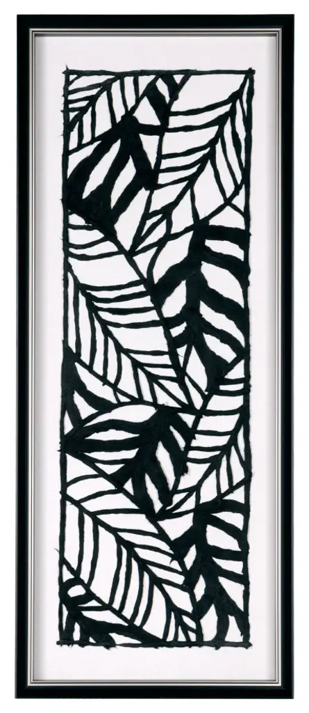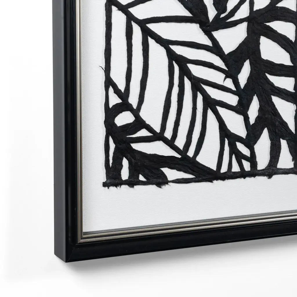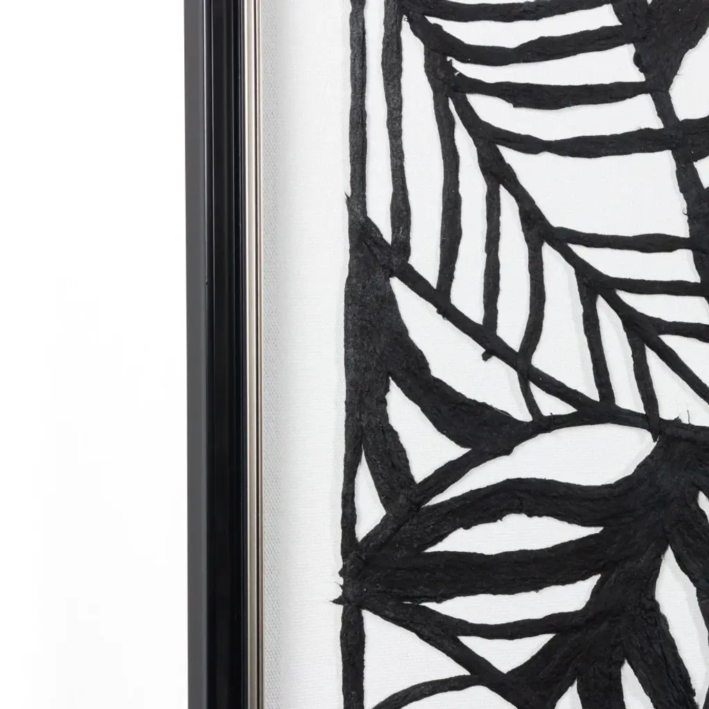 Curate your own gallery with this modern and unique shadow box. Featuring a black frame, this bold black and white artwork is made using paper pulp that is hand laid in a thoughtfully designed botanical pattern. Beautiful on it''s own or pair 2 on either side of a doorway or fireplaceProduct Dimensions: 16" x 1.5" x 40"Hand laid paper pulp on linen backShadow Box - Black Frame with glass coverReady to hang