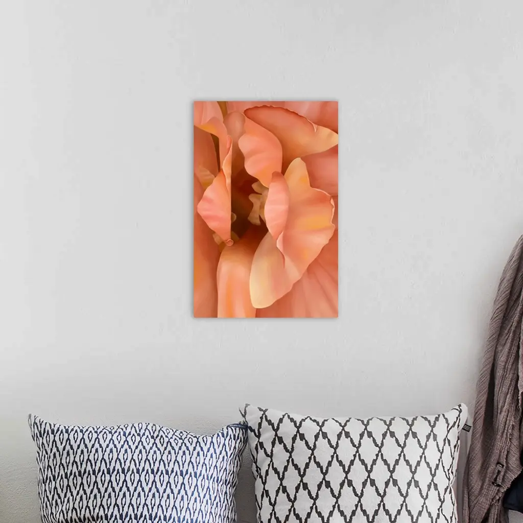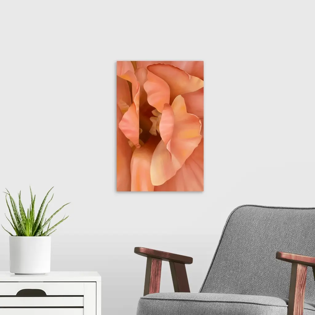 Vertical close up floral painting of layers of petals in a light yellow and orange.