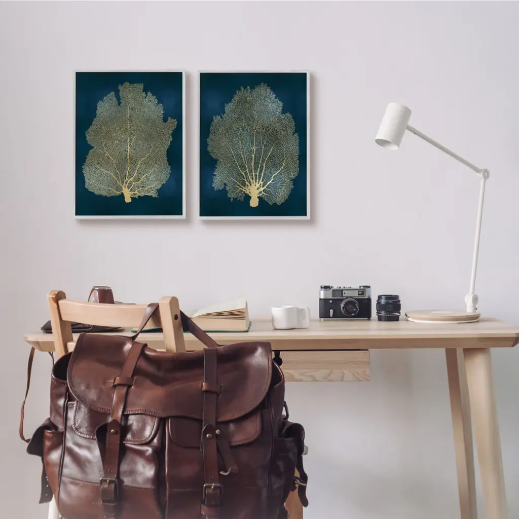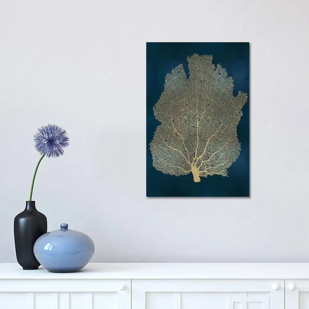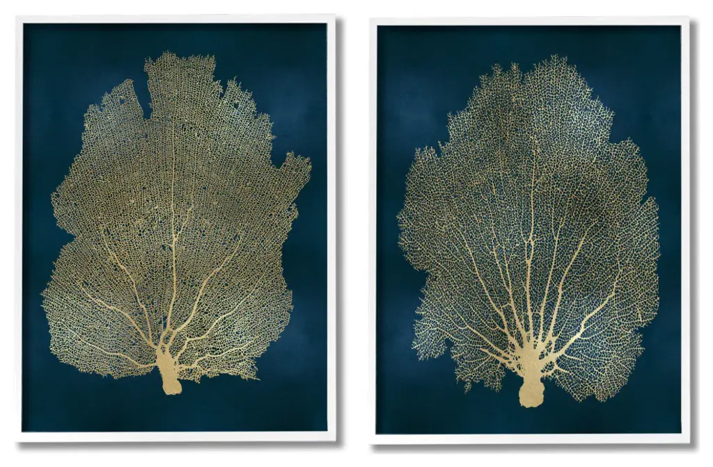 Modern Sea Fan Composition Blue Gold Ocean Plant,2pc, Each 11 X 14