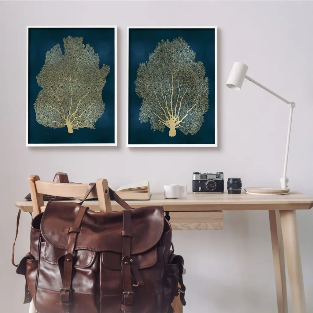 Modern Sea Fan Composition Blue Gold Ocean Plant,2pc, Each 24 X 30