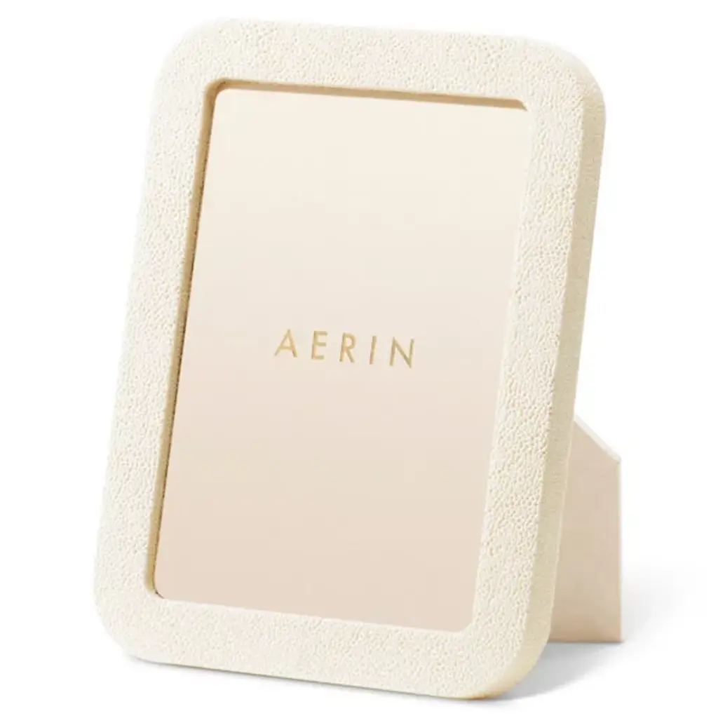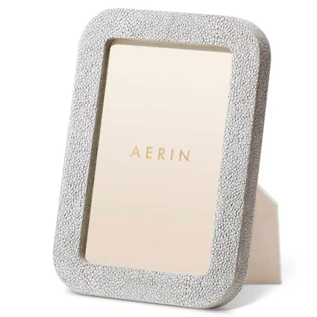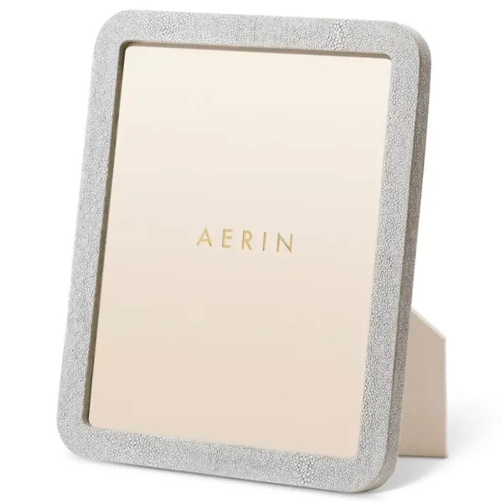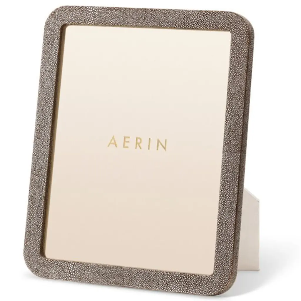 The Modern Shagreen Photo Frame from AERIN takes a minimalist approach with rounded corners that soften the rectangular format. The embossed covering creates texture without additional ornamentation, letting photographs remain the central focus. Curved edges prevent the frame from appearing rigid, while the smooth corners feel comfortable in hand. The textured surface provides a secure grip during photo changes and cleaning. An integrated easel back allows stable tabletop positioning in casual settings like bedrooms or kitchens. This streamlined design complements displayed images rather than competing for attention, making it suitable for everyday family photographs and artwork.